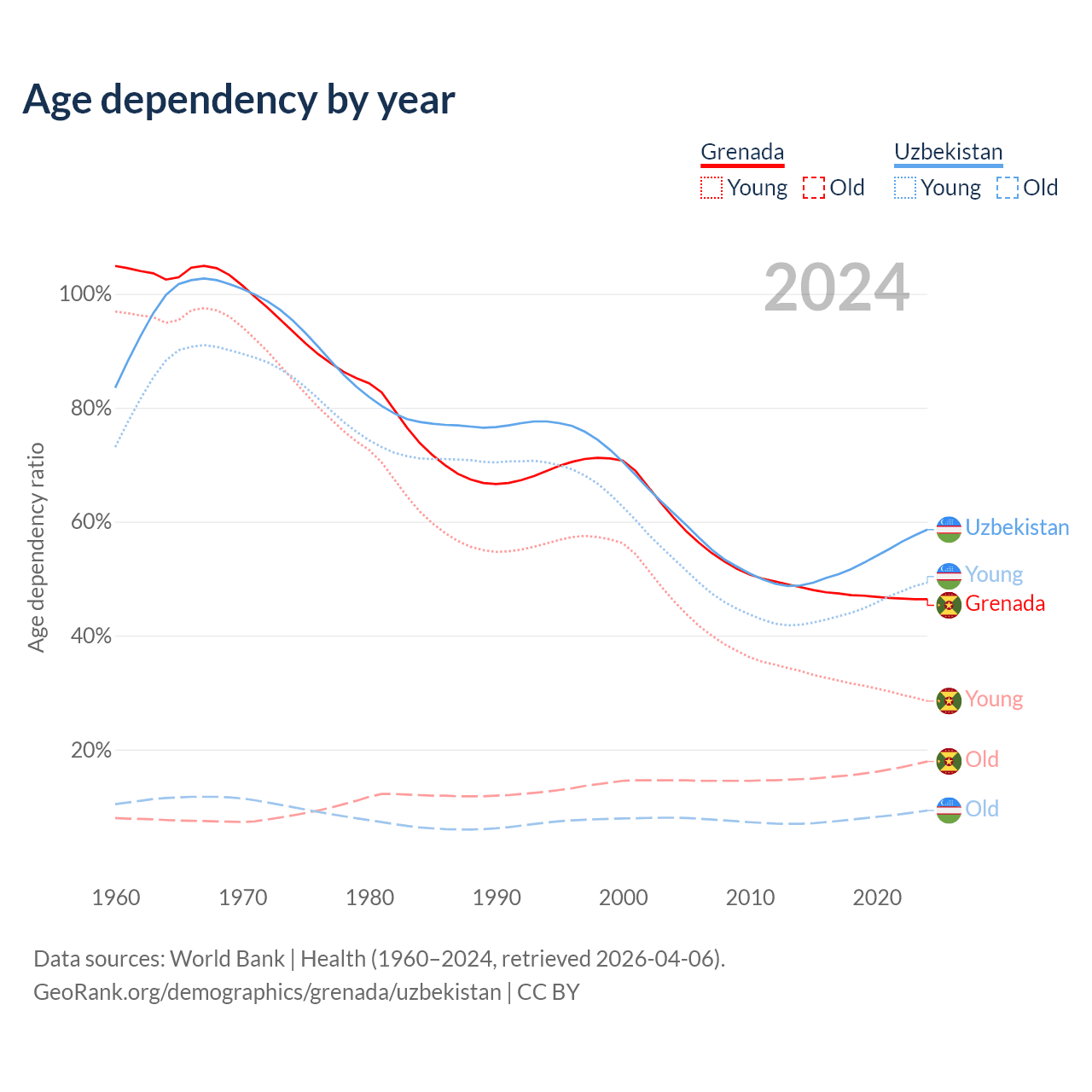 Data sources: World Bank | Health (1960–2024, retrieved 2026-04-06); U.S. Census Bureau (1960–2024, retrieved 2026-02-08).