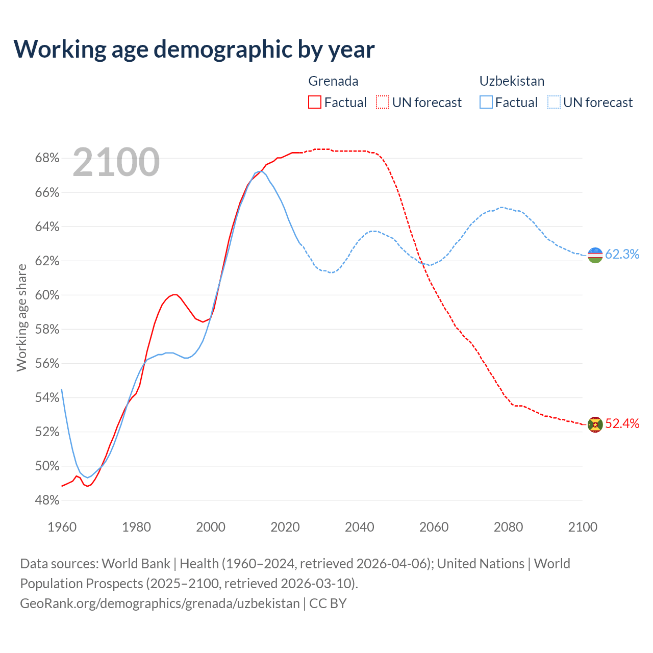 - Grenada has 80.2K working age adults (aged 15-64) vs 23.9M in Uzbekistan.