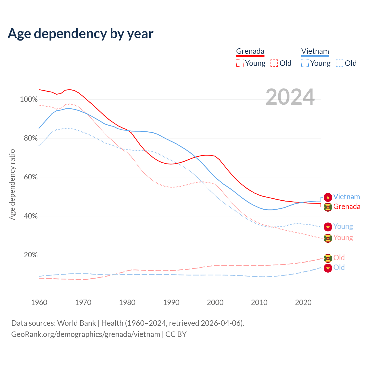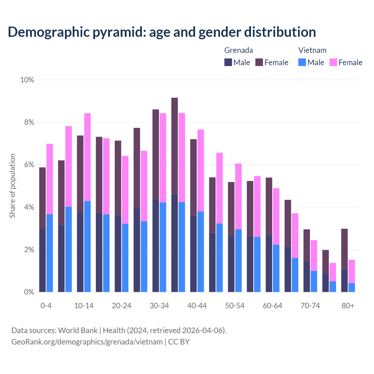 - Grenada is ranked 77/196 by median age (oldest to youngest) vs 84/196 for Vietnam.