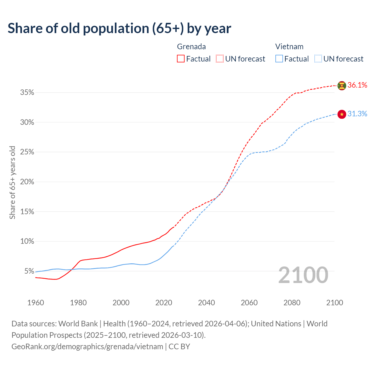 - The share of old-age demographic (65+) in Grenada is 12.2% vs 9.05% in Vietnam.