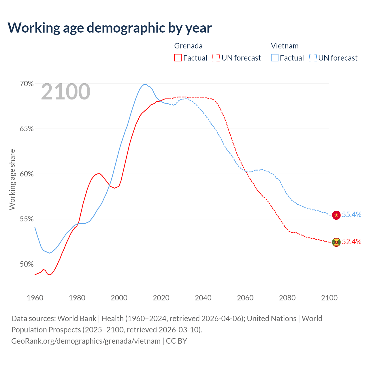 - Grenada has 80.2K working age adults (aged 15-64) vs 69.3M in Vietnam.
