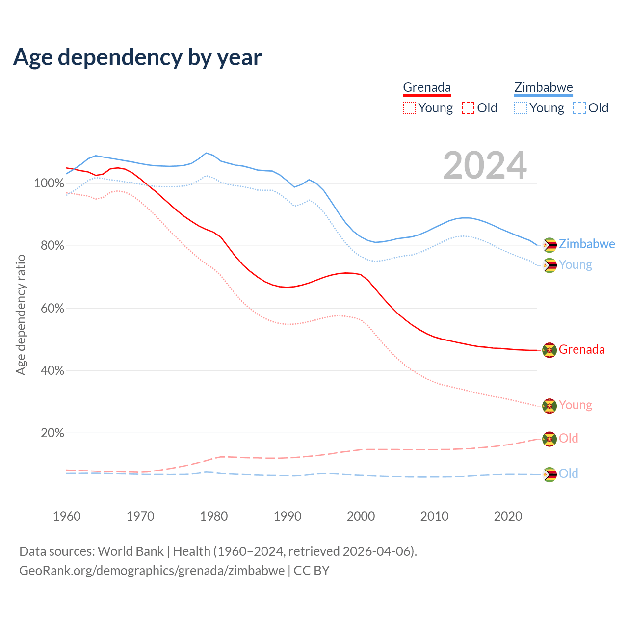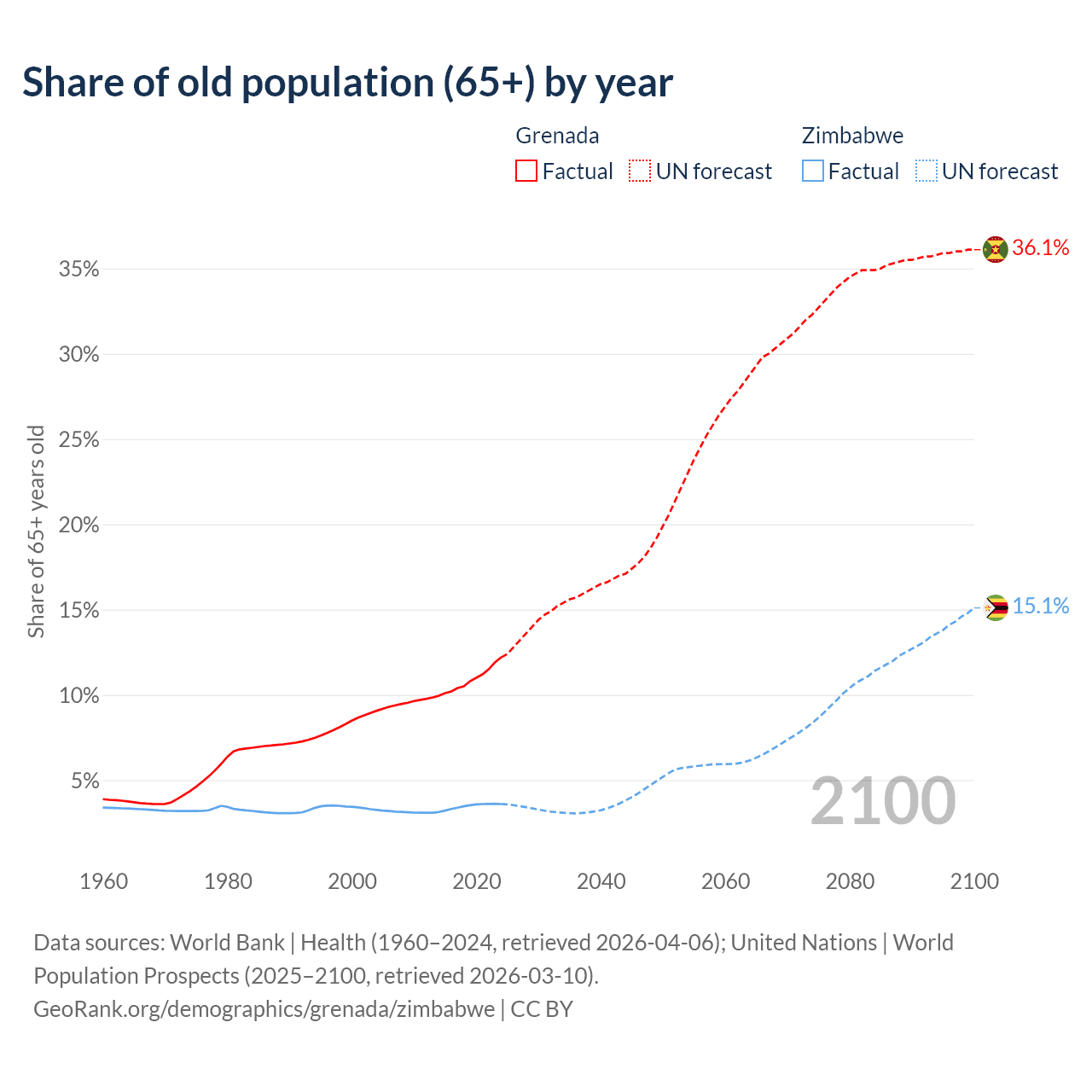 - The share of old-age demographic (65+) in Grenada is 12.2% vs 3.6% in Zimbabwe.