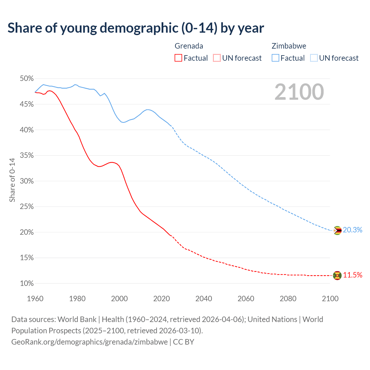 - The share of young demographic (0-15 years old) in Grenada is 19.4% vs 40.9% in Zimbabwe.