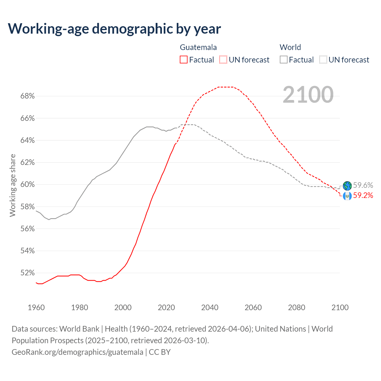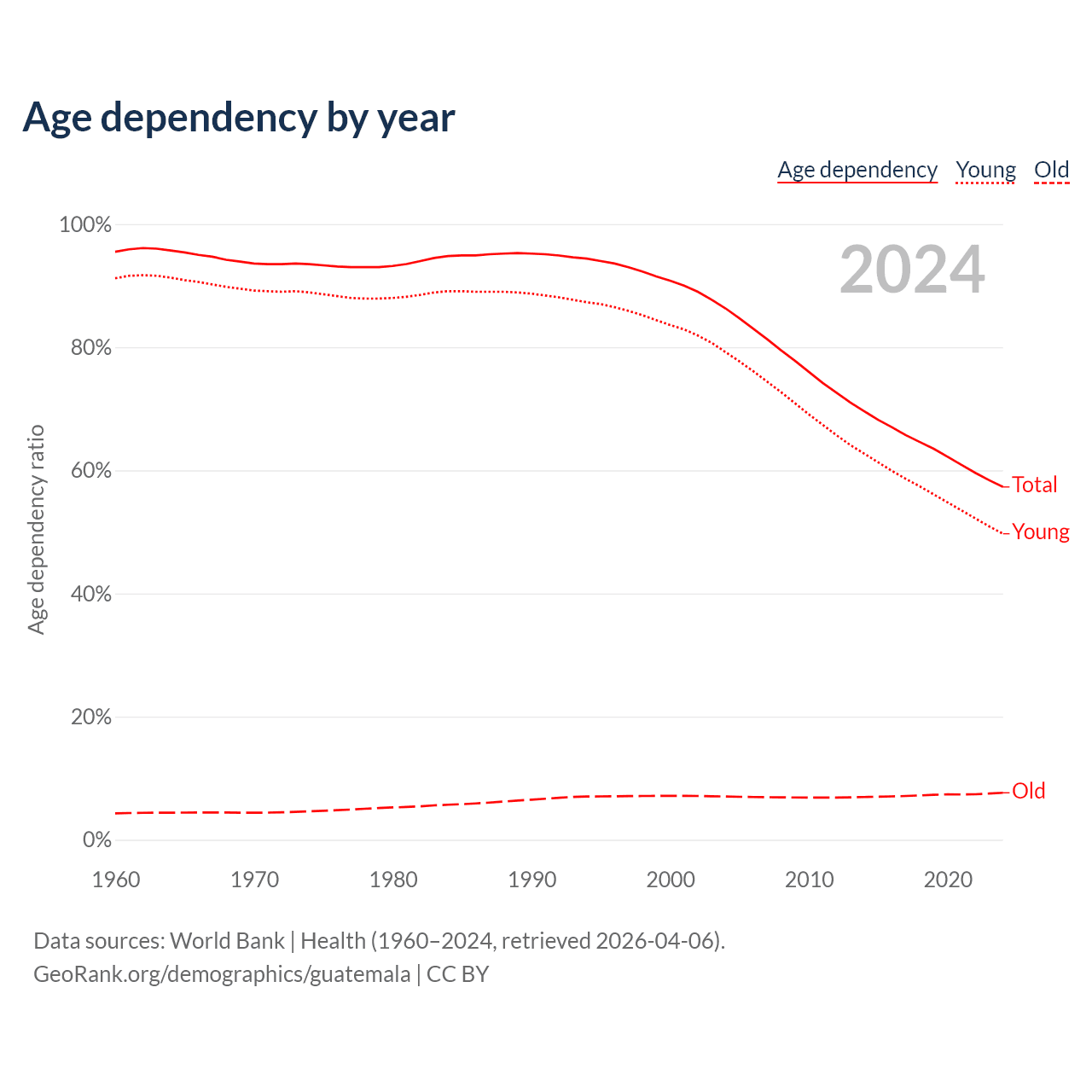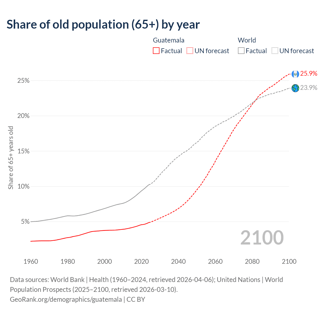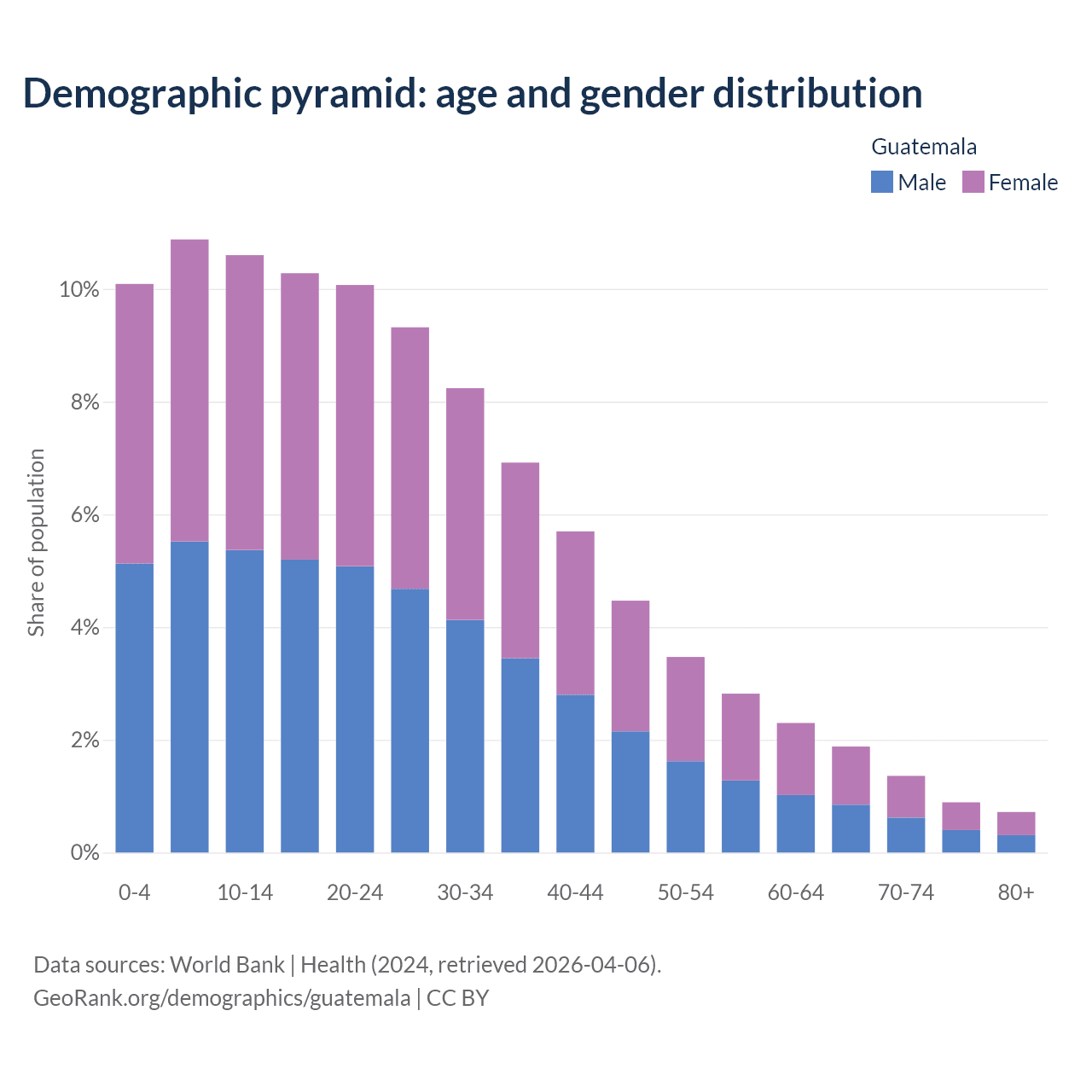 With a population of 18.4M people, Guatemala has a median age of 24 years which makes it the 137/196 oldest country. 31.6% of the demographic are children 0-14 years old, 63.6% are working-age people aged 15-64, and 4.85% are older population aged 65+ years.