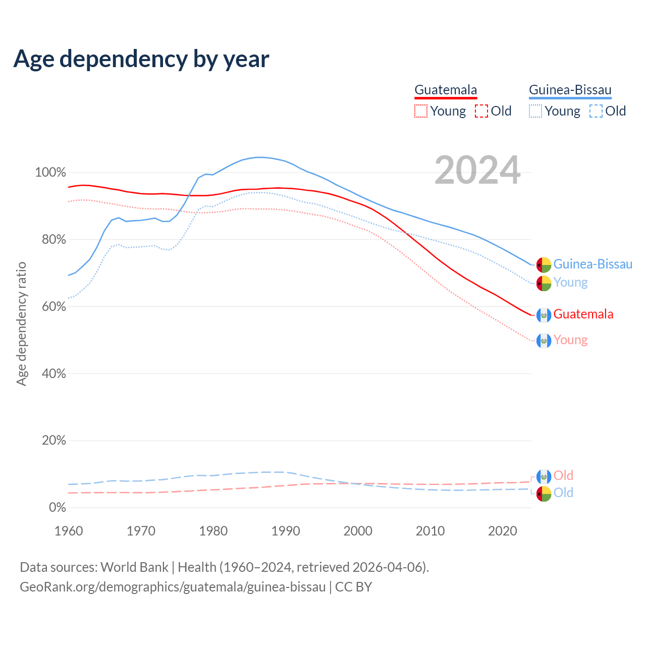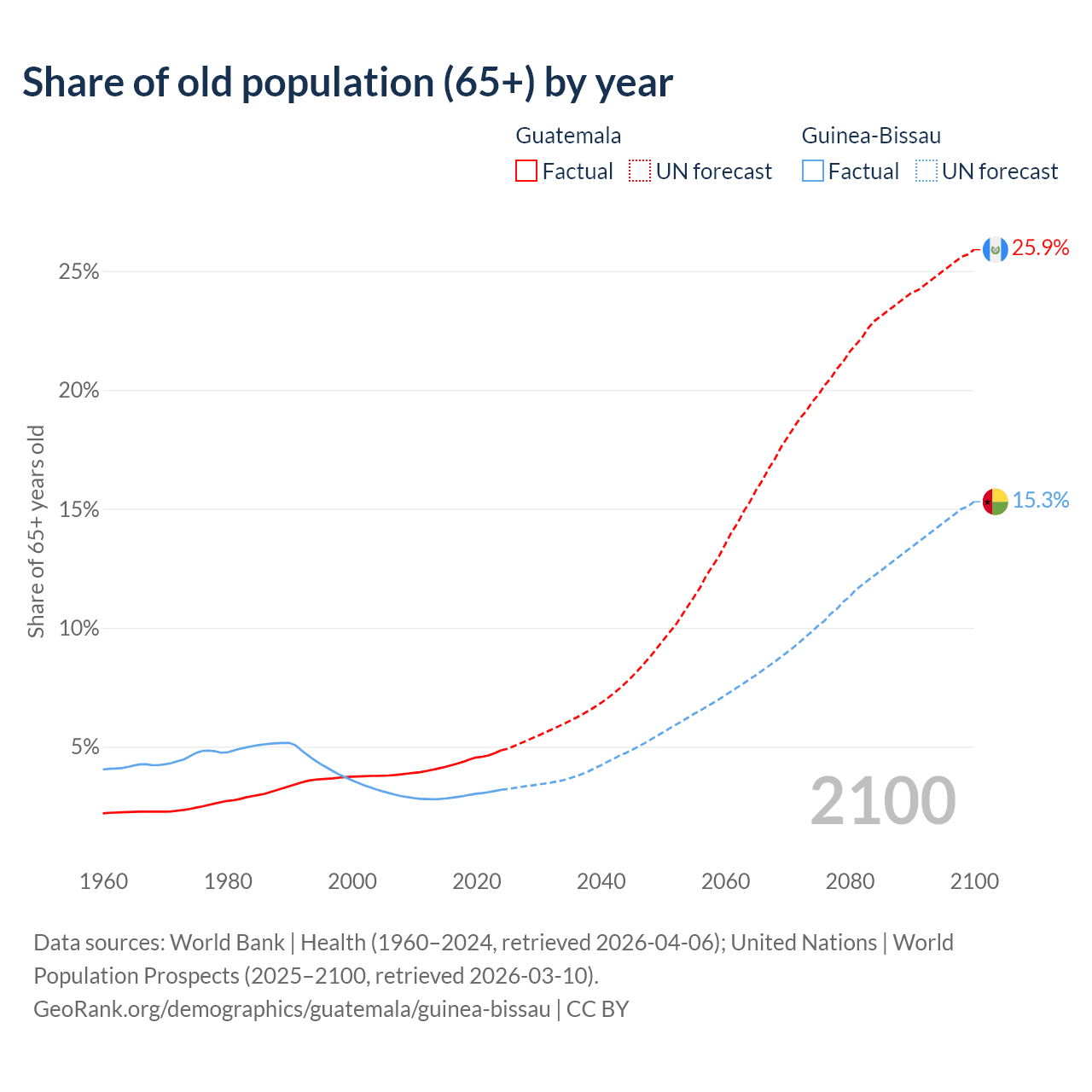 - The share of old-age demographic (65+) in Guatemala is 4.85% vs 3.19% in Guinea-Bissau.
