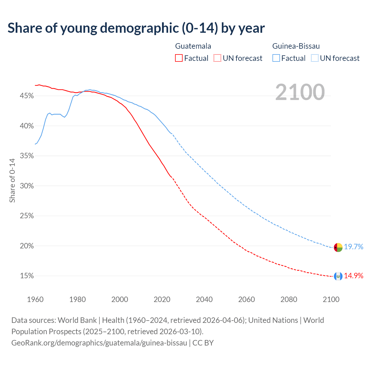 - The share of young demographic (0-15 years old) in Guatemala is 31.6% vs 38.8% in Guinea-Bissau.