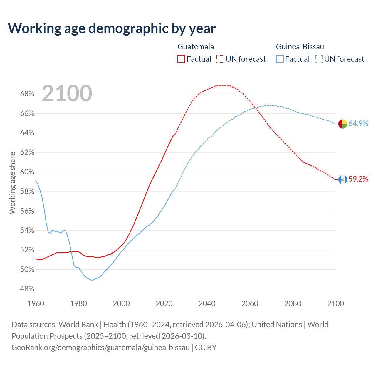 - Guatemala has 12.1M working age adults (aged 15-64) vs 1.34M in Guinea-Bissau.