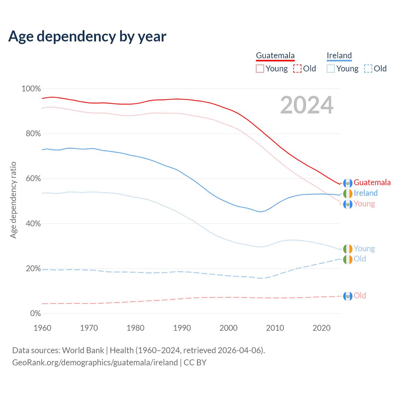 - The share of old-age demographic (65+) in Guatemala is 4.85% vs 15.9% in Ireland.