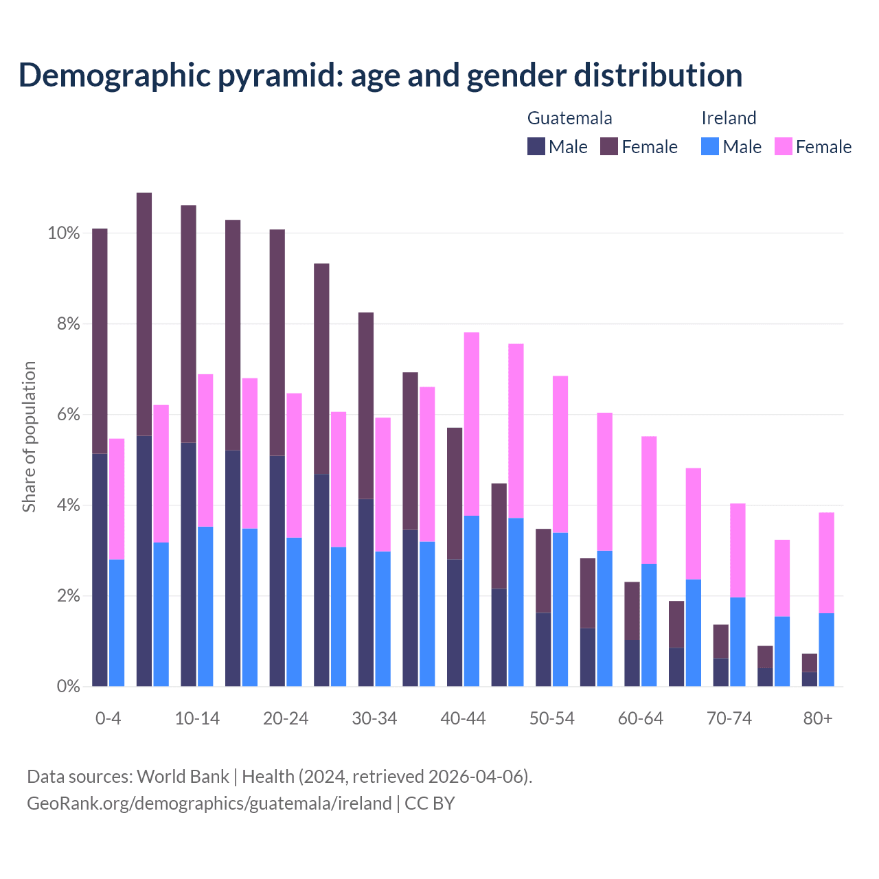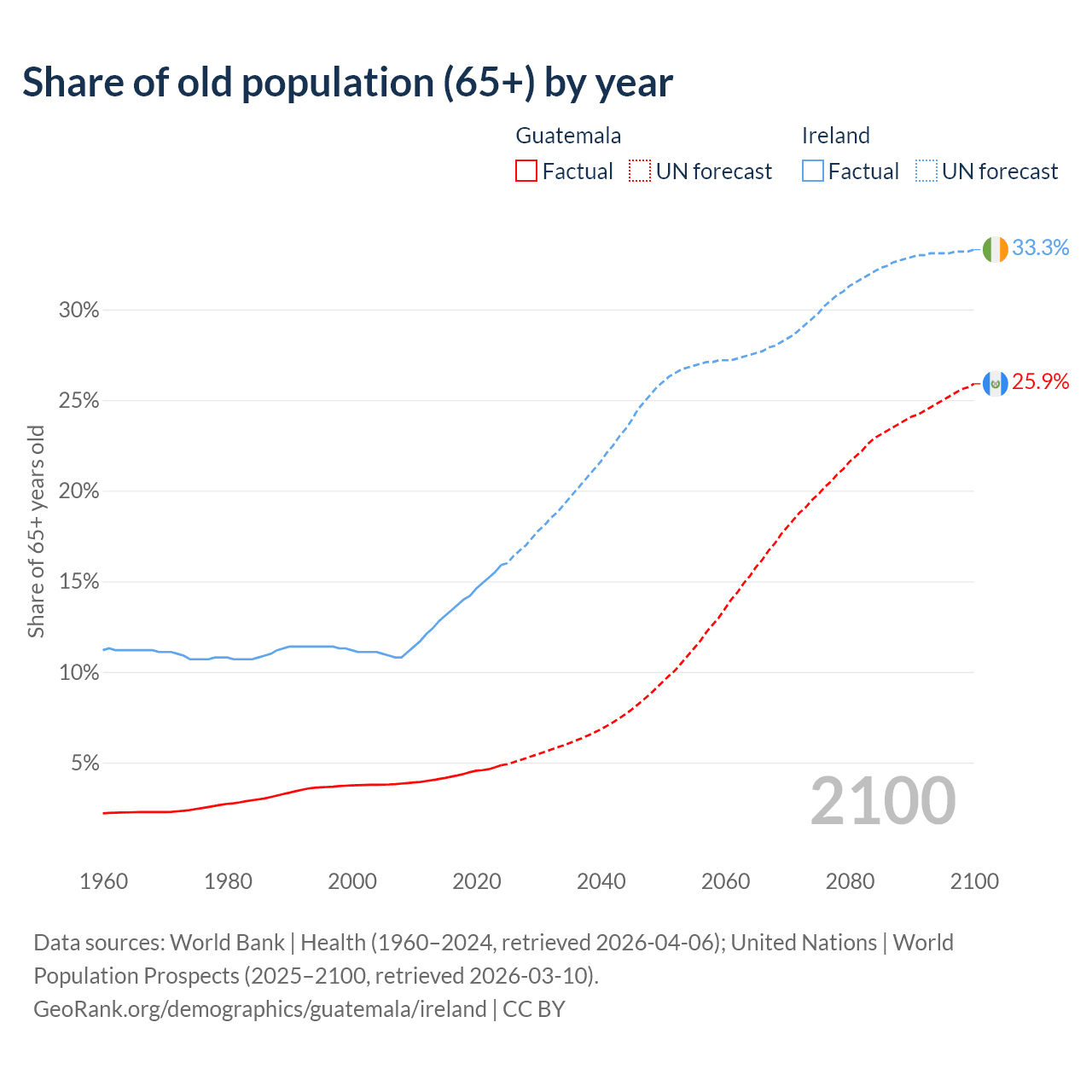 The share of older people aged 65 and over is 4.85% in Guatemala and 15.9% in Ireland. Life expectancy in Guatemala compared to Ireland .