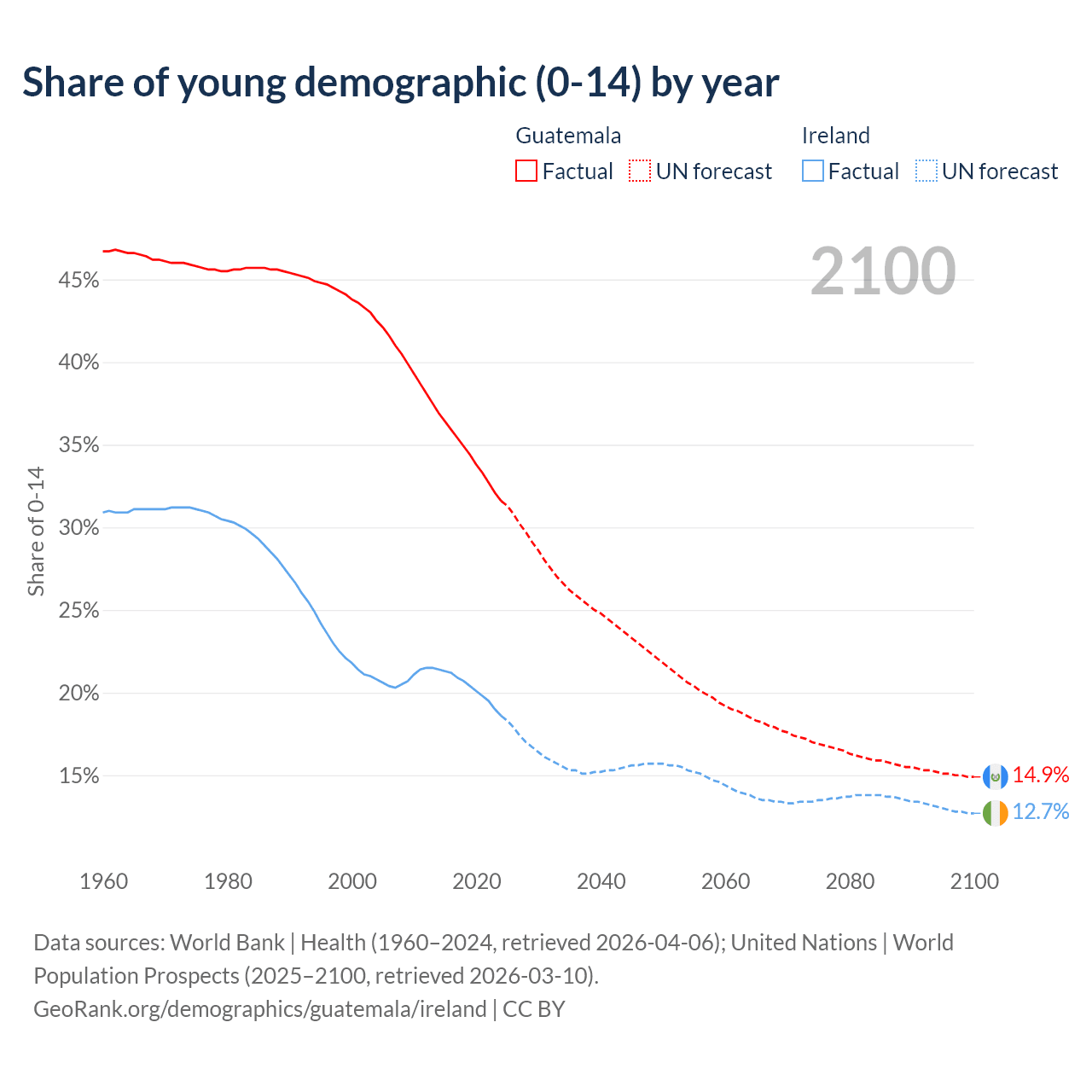 - The share of young demographic (0-15 years old) in Guatemala is 31.6% vs 18.6% in Ireland.
