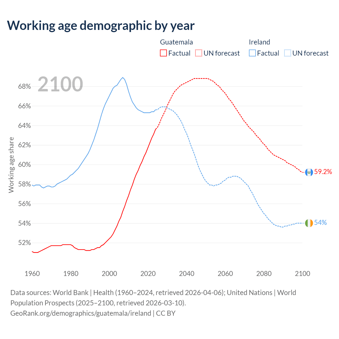 Median age Guatemala vs Ireland, 1960-2100