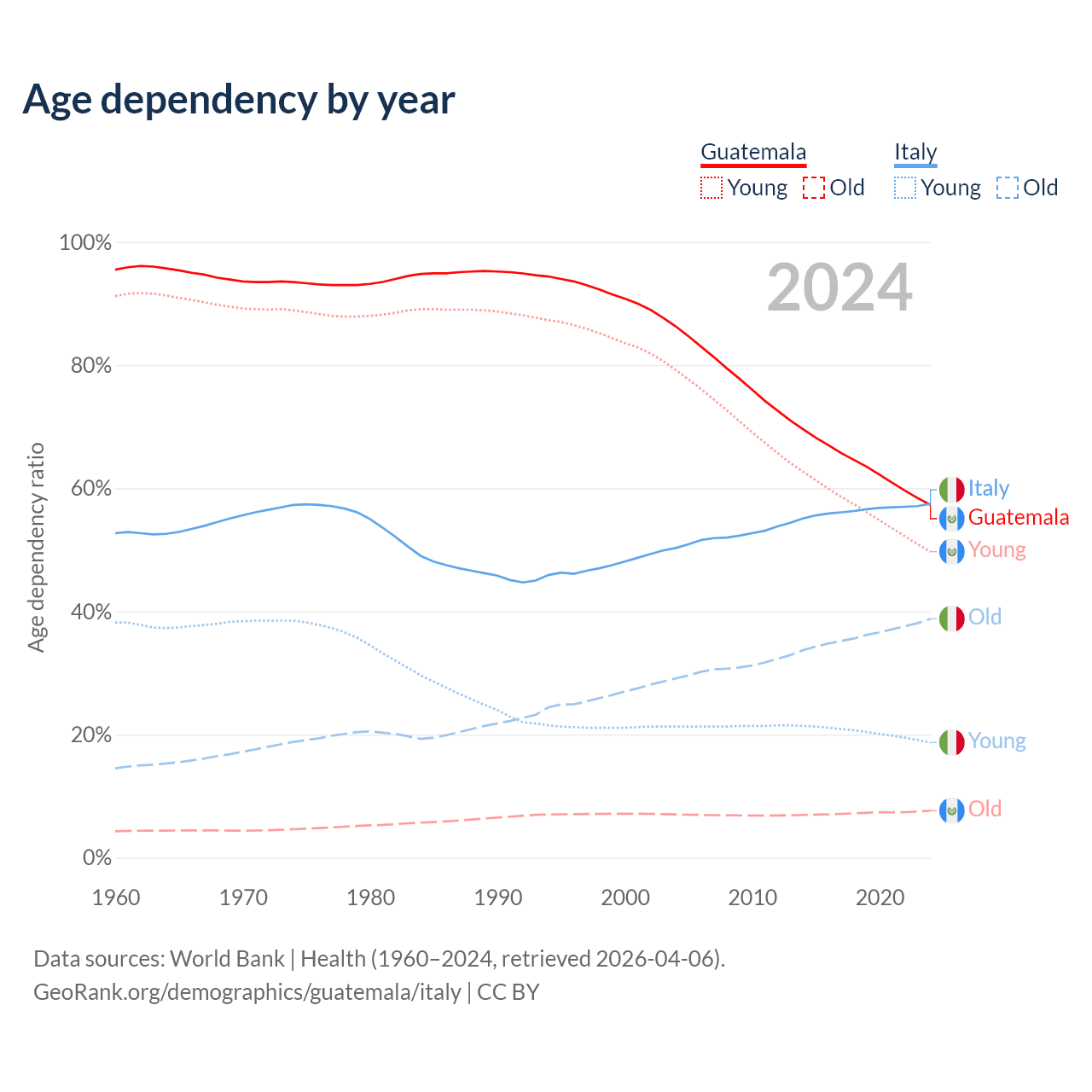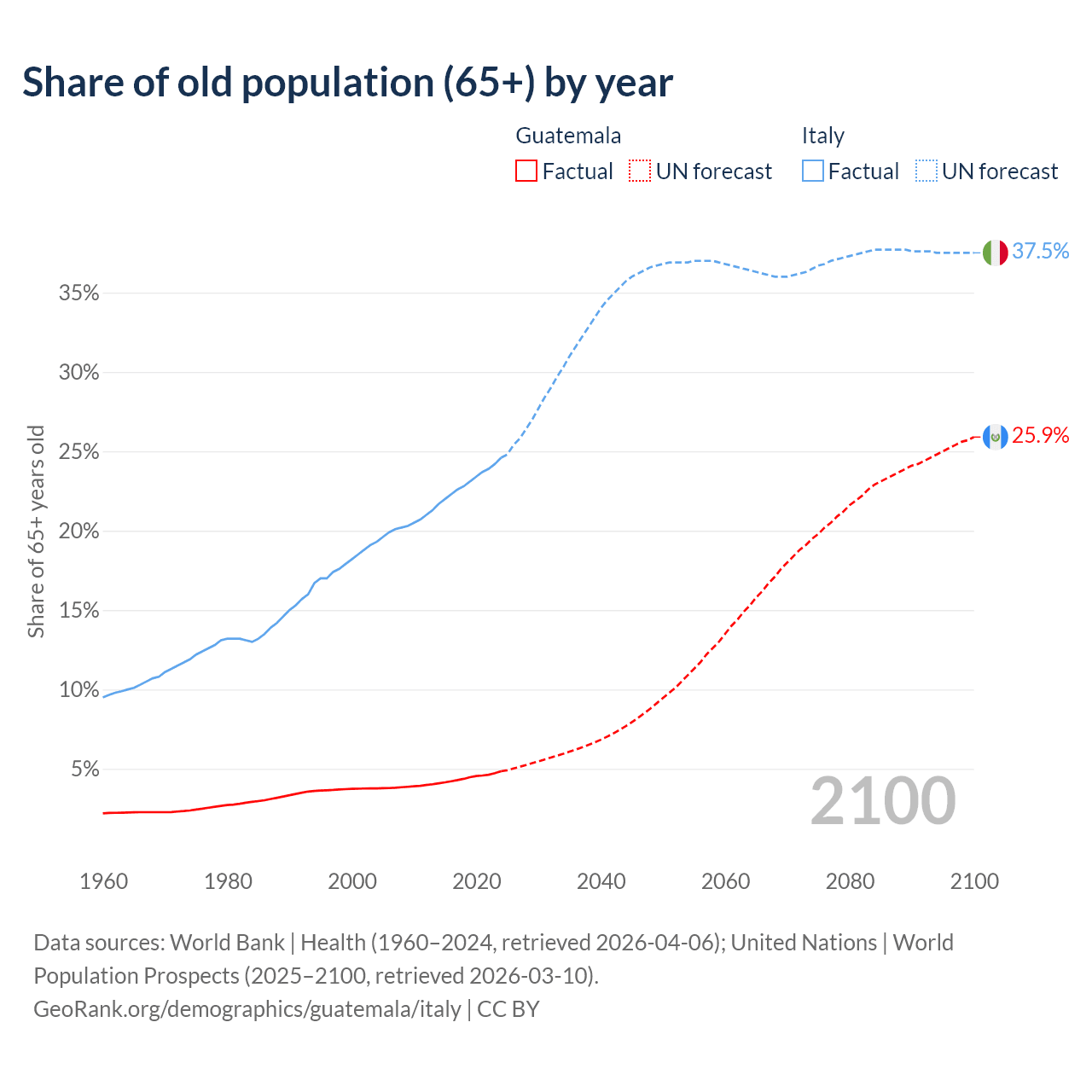 The share of older people aged 65 and over is 4.85% in Guatemala and 24.6% in Italy. Life expectancy in Guatemala compared to Italy .
