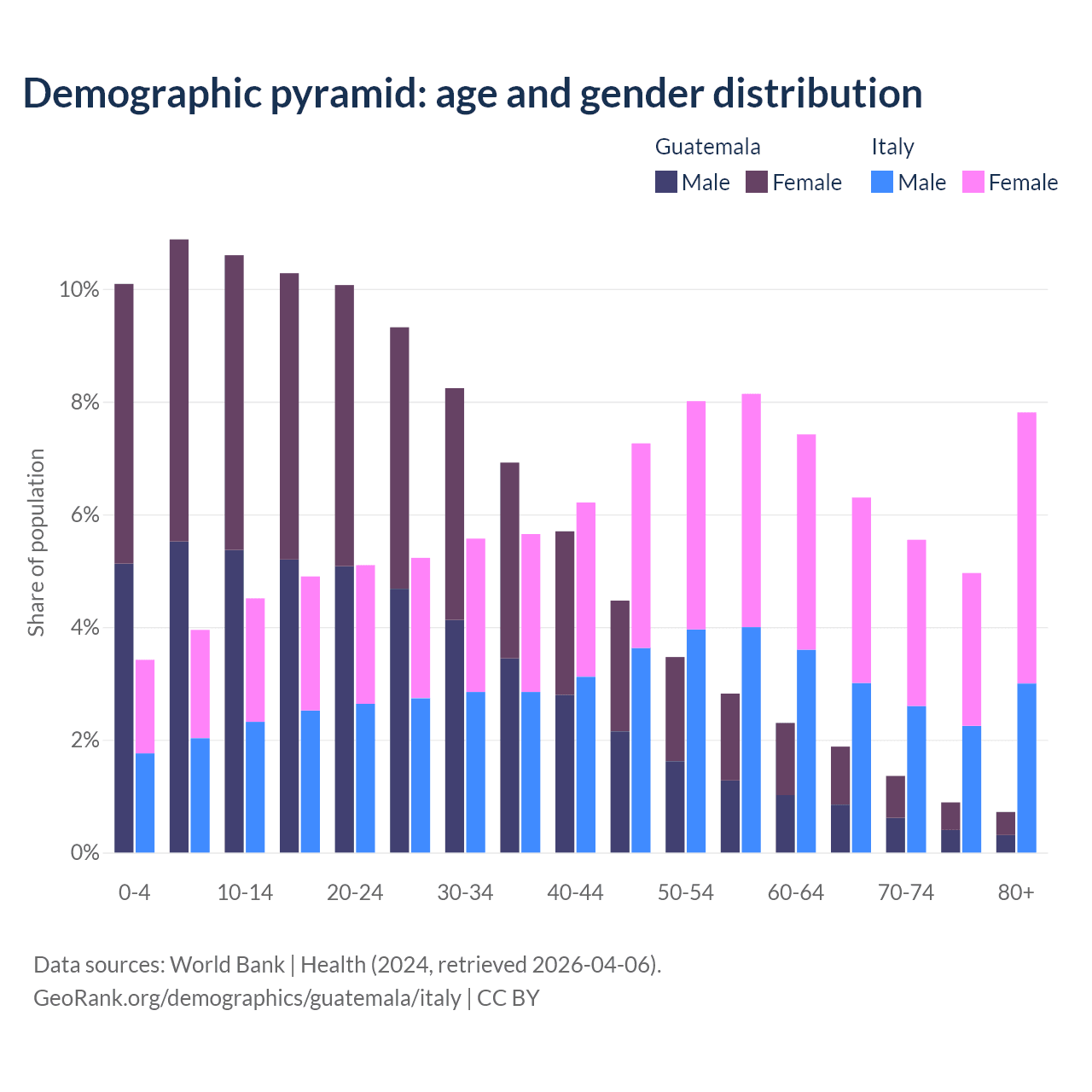 - The share of old-age demographic (65+) in Guatemala is 4.85% vs 24.6% in Italy.