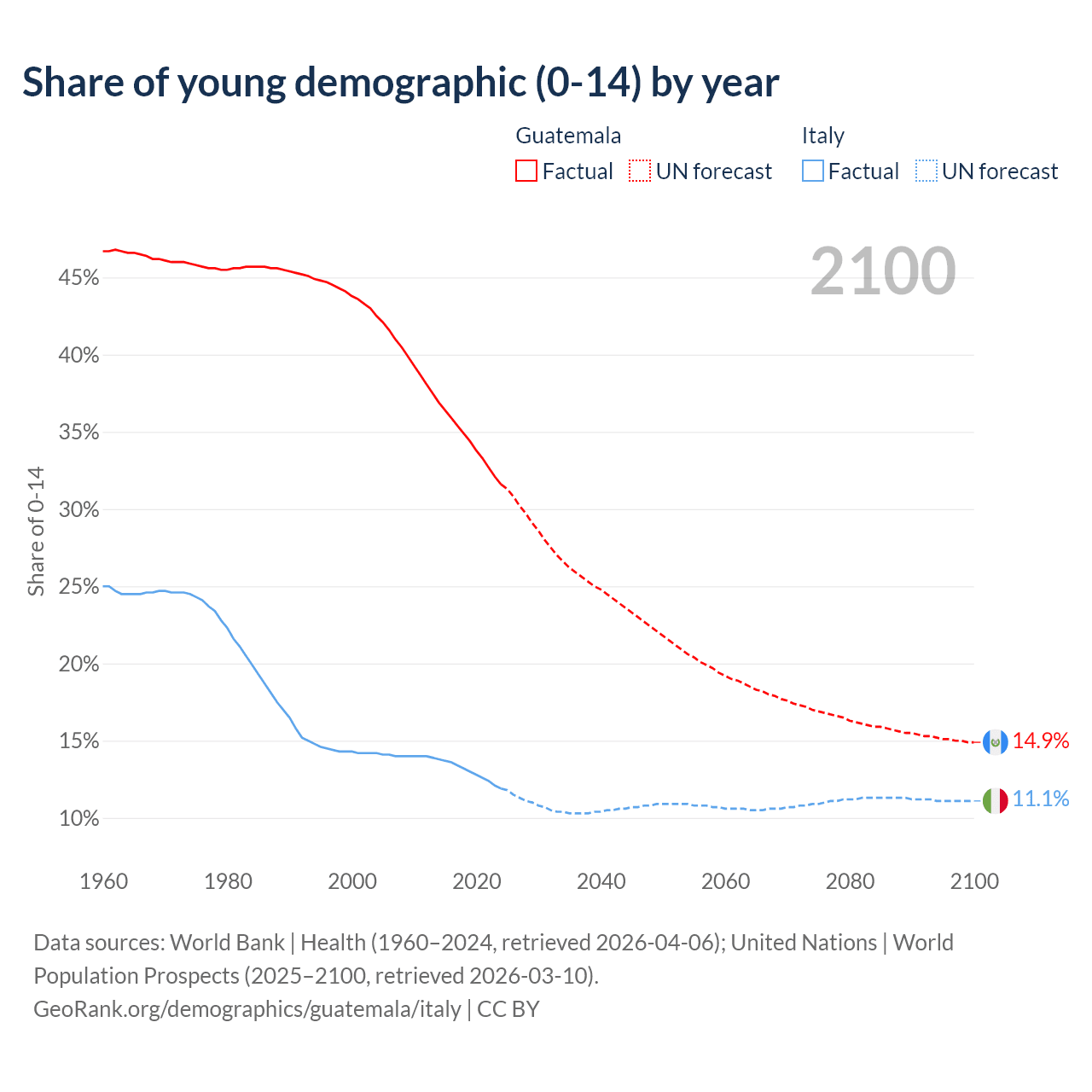 - The share of young demographic (0-15 years old) in Guatemala is 31.6% vs 11.9% in Italy.