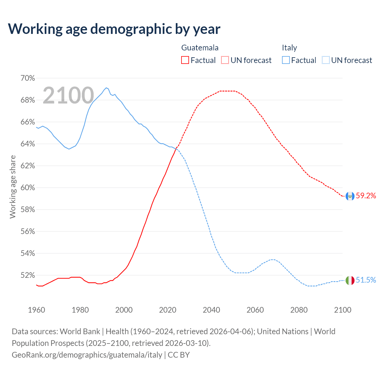 Median age Guatemala vs Italy, 1960-2100