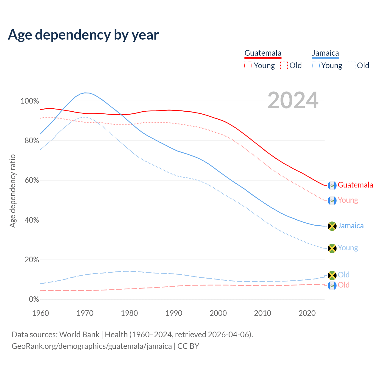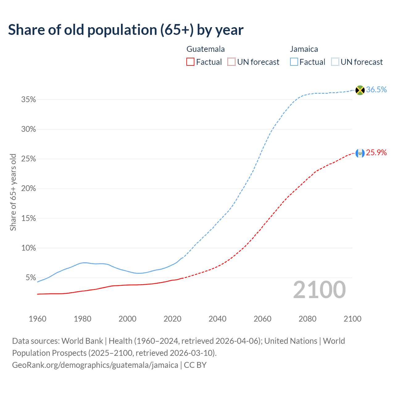 The share of older people aged 65 and over is 4.85% in Guatemala and 8.21% in Jamaica. Life expectancy in Guatemala compared to Jamaica .