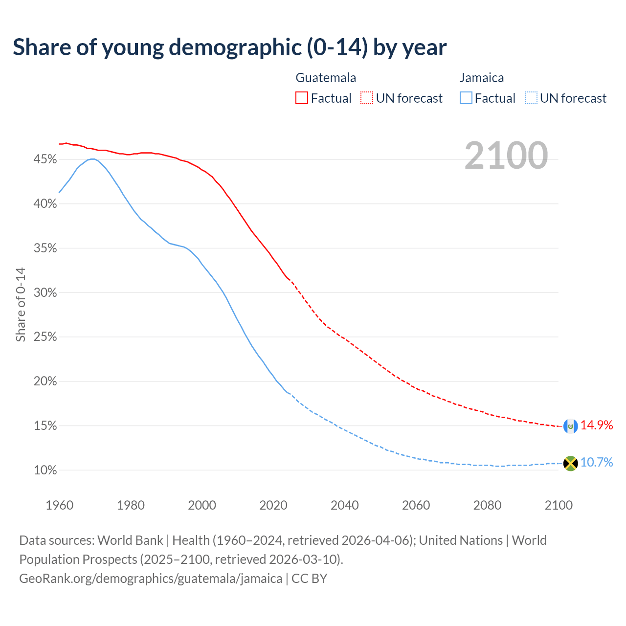 - The share of young demographic (0-15 years old) in Guatemala is 31.6% vs 18.7% in Jamaica.