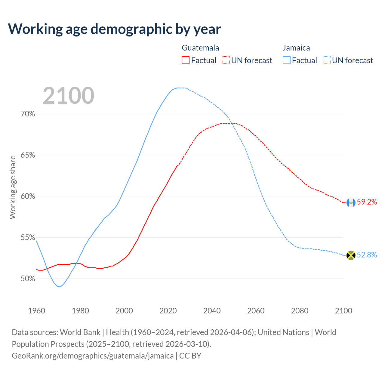 - Guatemala has 12.1M working age adults (aged 15-64) vs 2.07M in Jamaica.