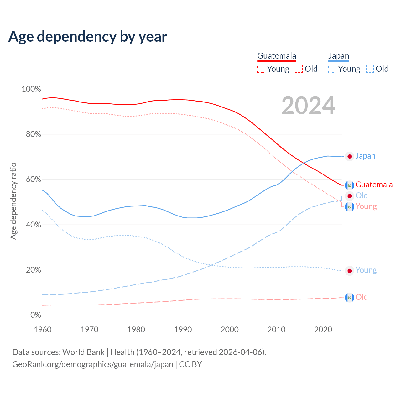 - Guatemala is ranked 137/196 by median age (oldest to youngest) vs 2/196 for Japan.