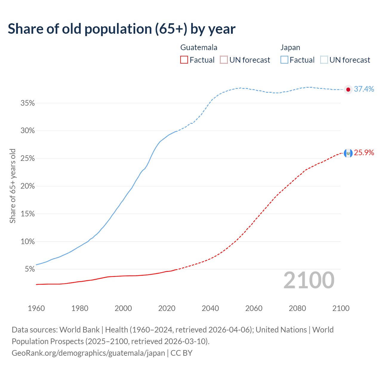 The share of older people aged 65 and over is 4.85% in Guatemala and 29.8% in Japan. Life expectancy in Guatemala compared to Japan .
