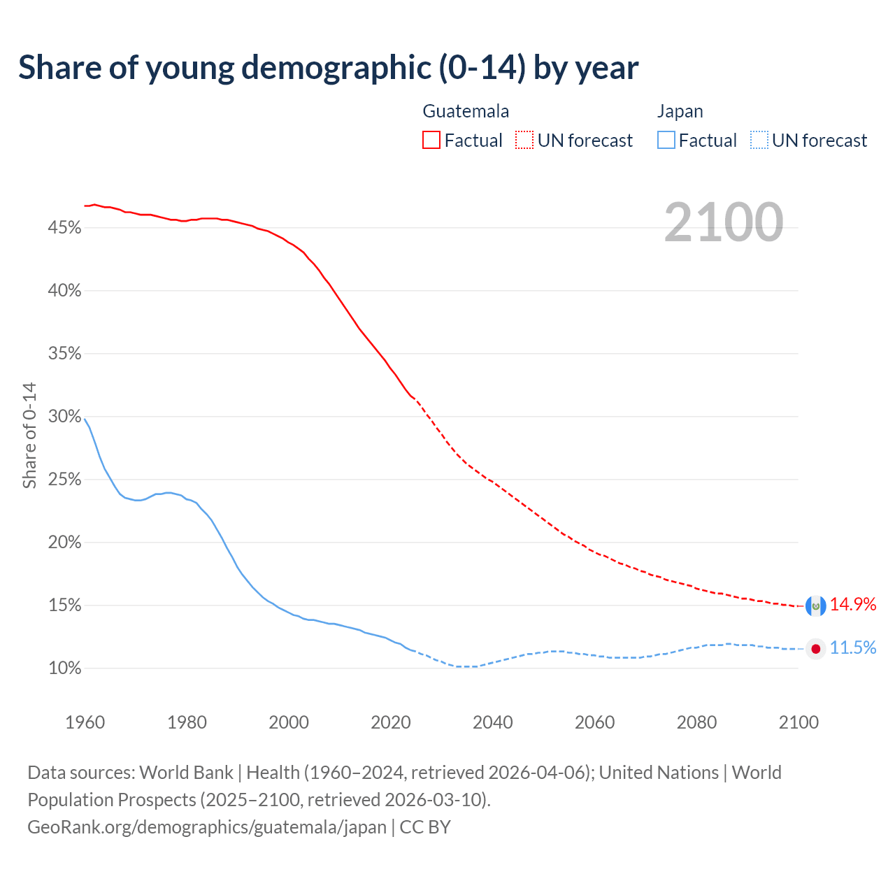 - The share of young demographic (0-15 years old) in Guatemala is 31.6% vs 11.4% in Japan.