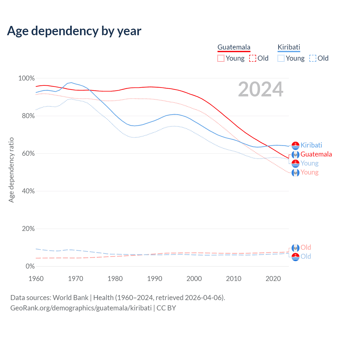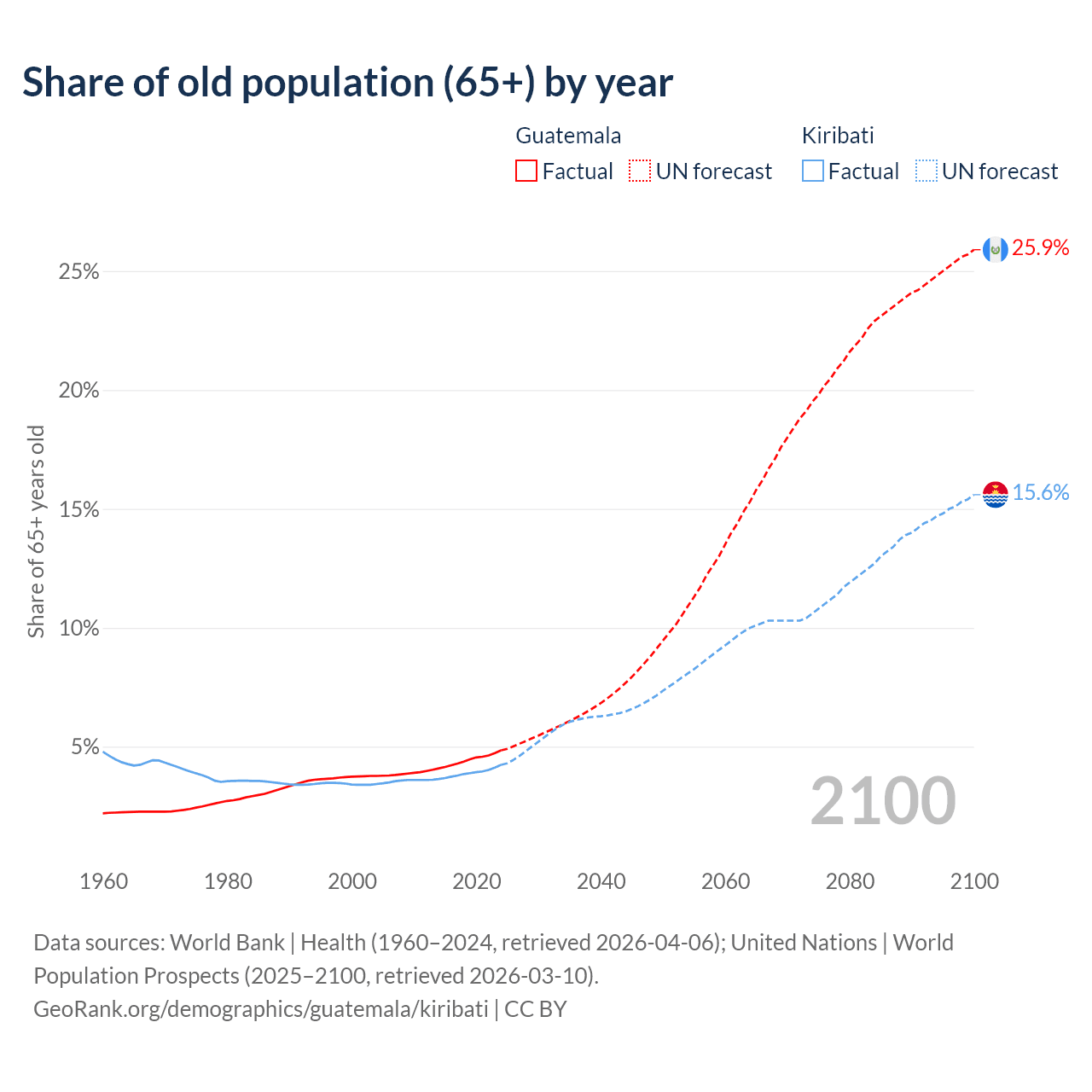 - The share of old-age demographic (65+) in Guatemala is 4.85% vs 4.24% in Kiribati.