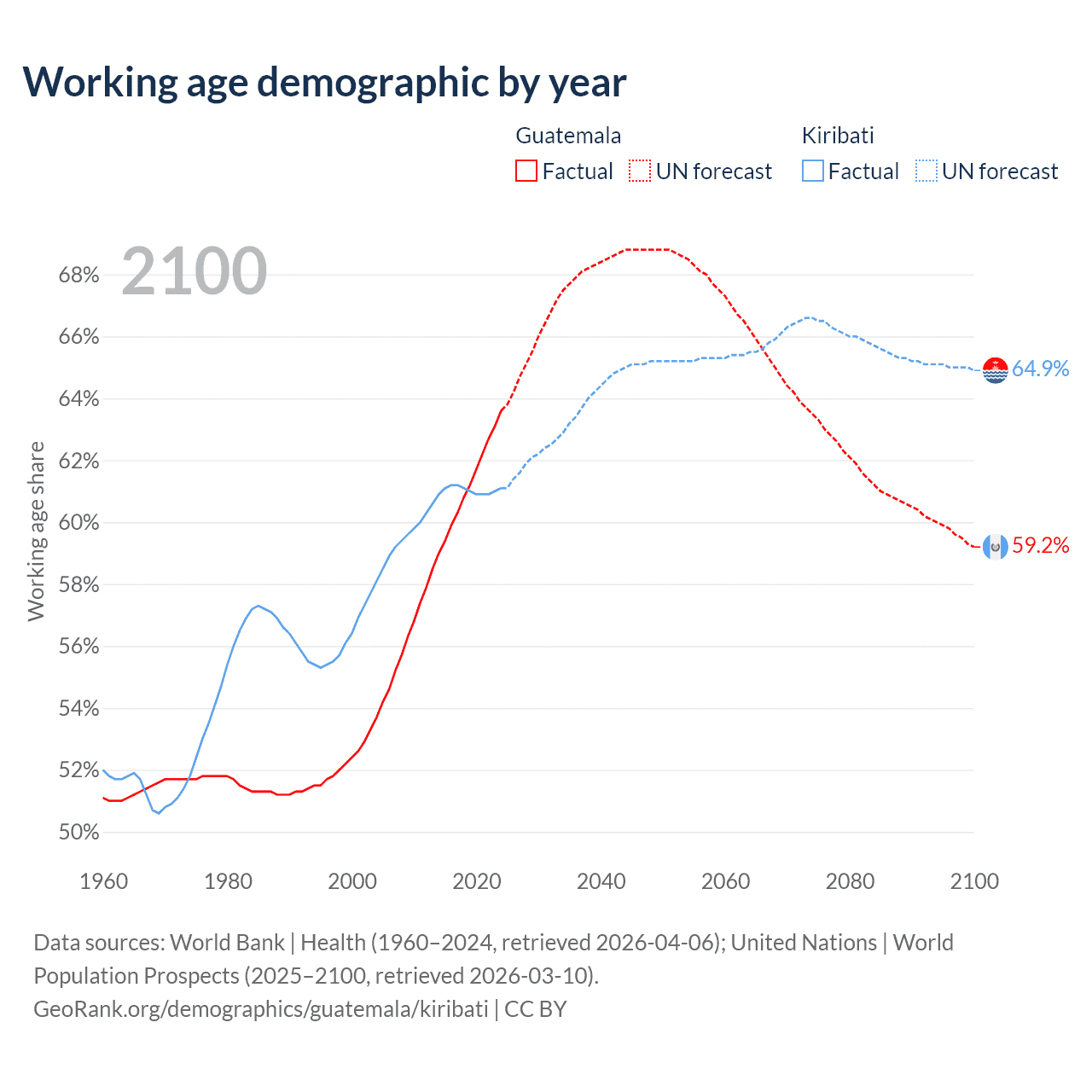 - The share of young demographic (0-15 years old) in Guatemala is 31.6% vs 34.7% in Kiribati.