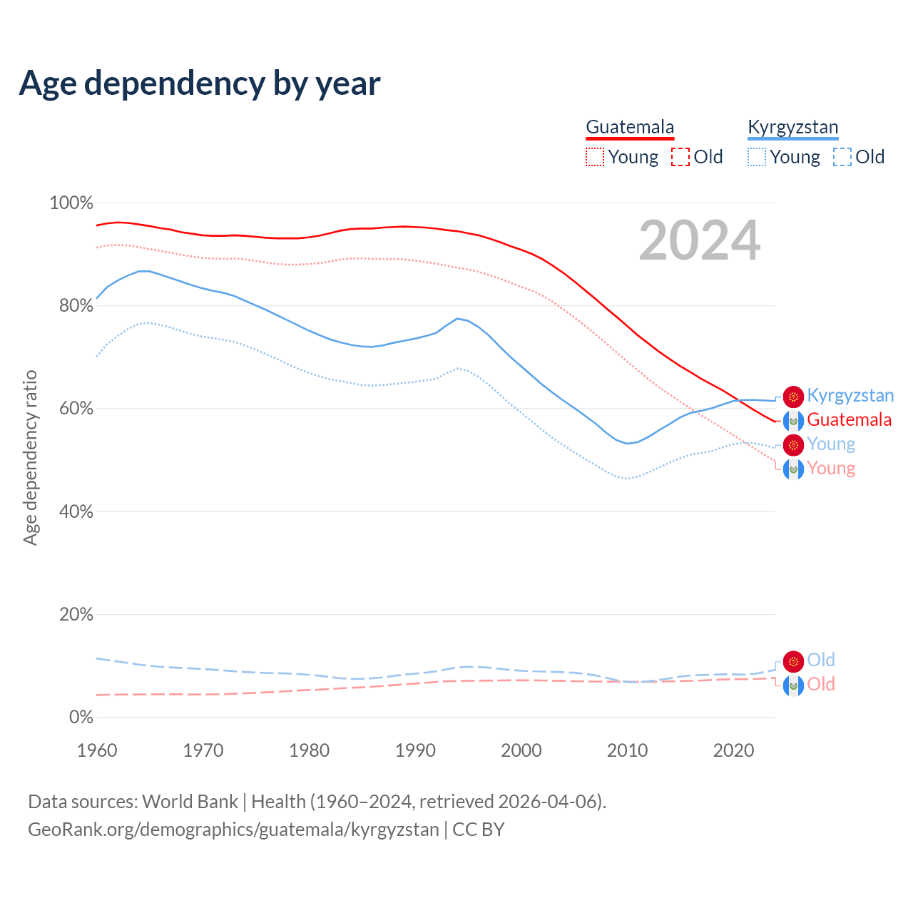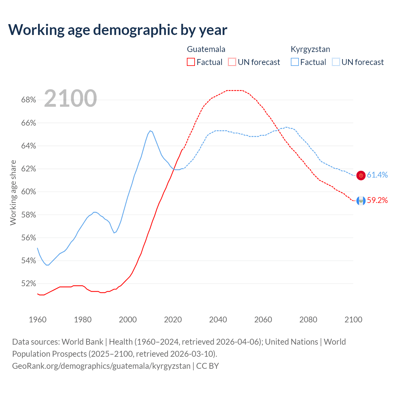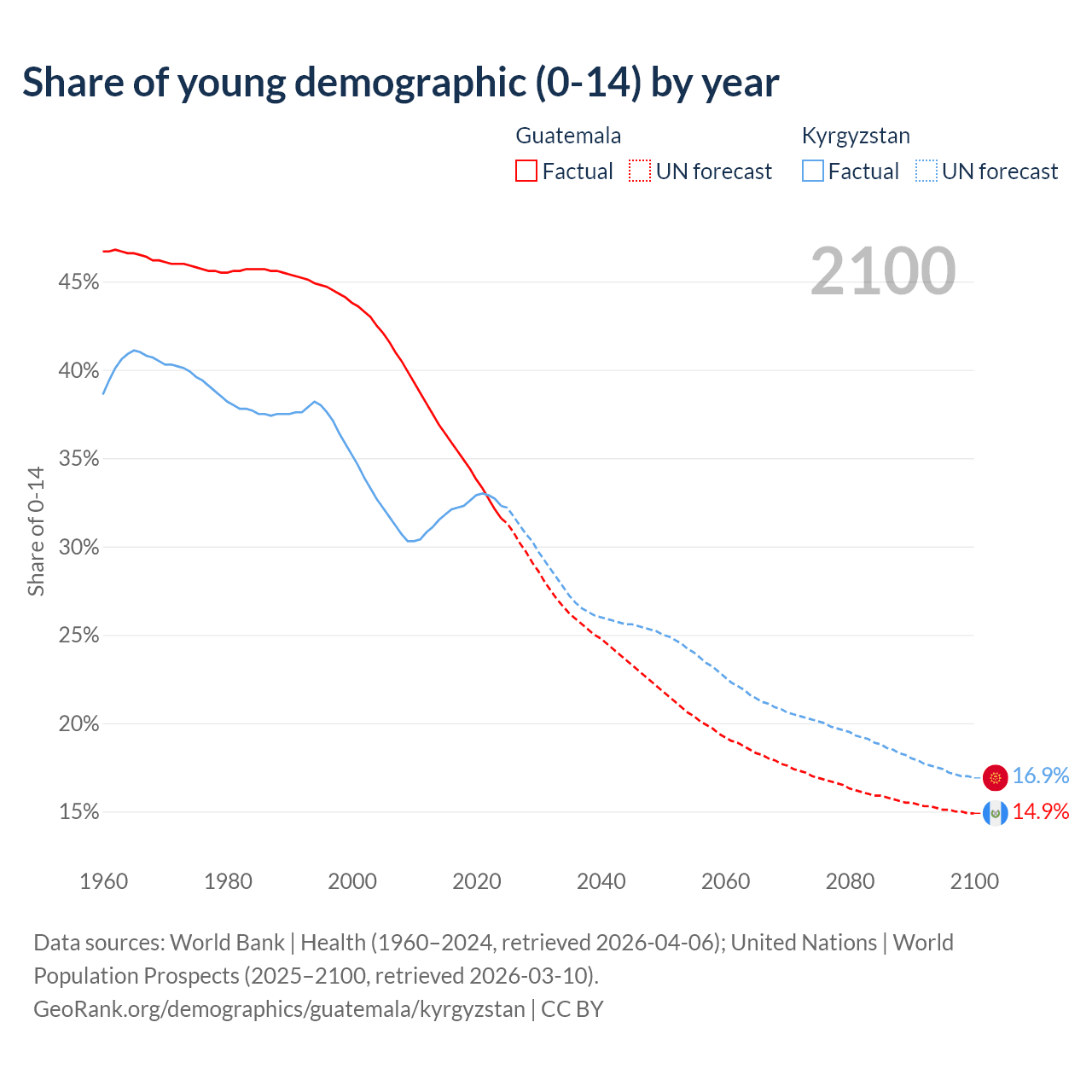 - The share of young demographic (0-15 years old) in Guatemala is 31.6% vs 32.3% in Kyrgyzstan.