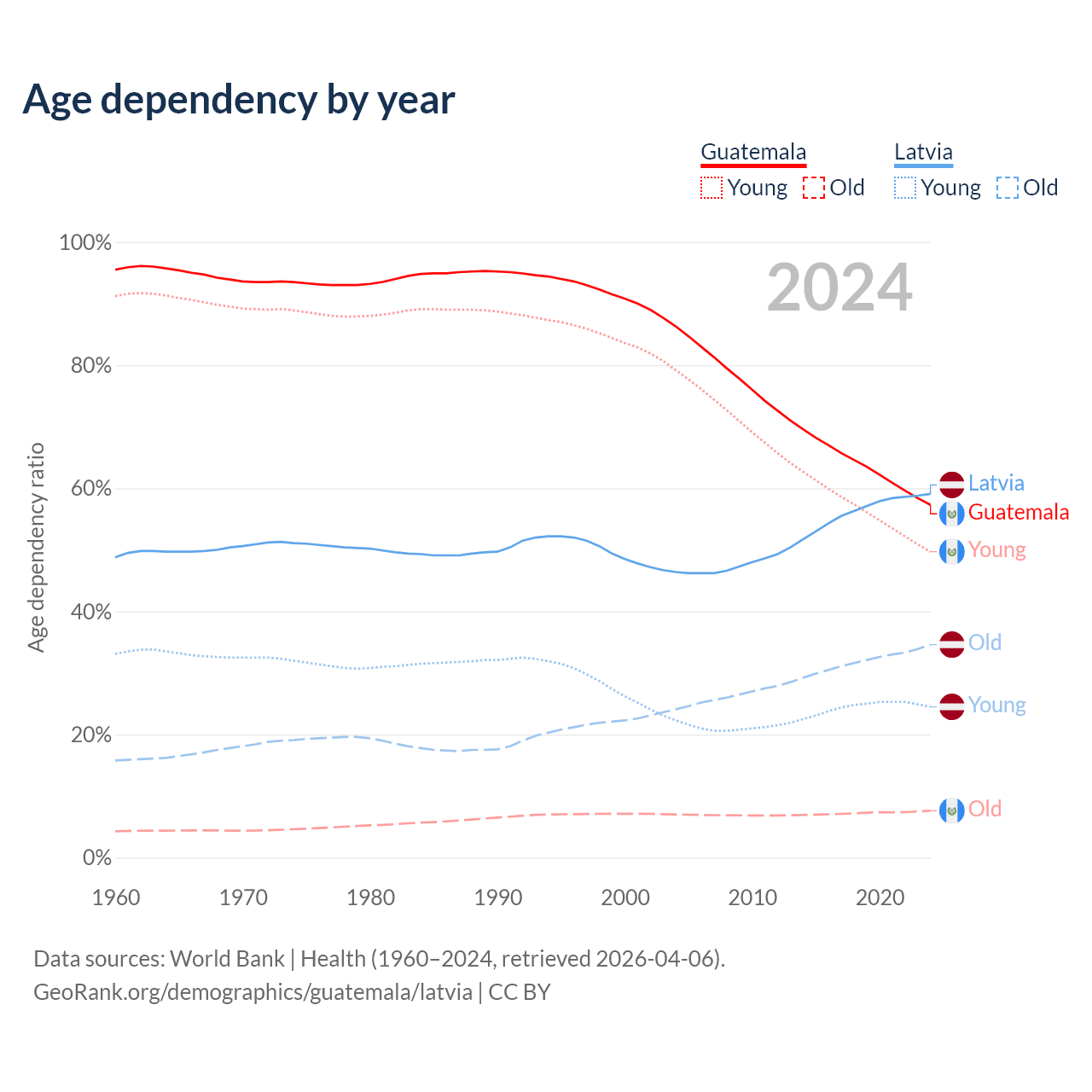 - The share of young demographic (0-15 years old) in Guatemala is 31.6% vs 15.4% in Latvia.