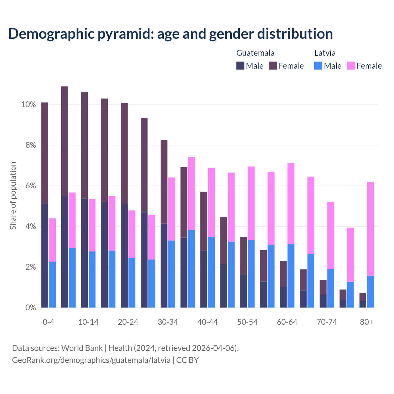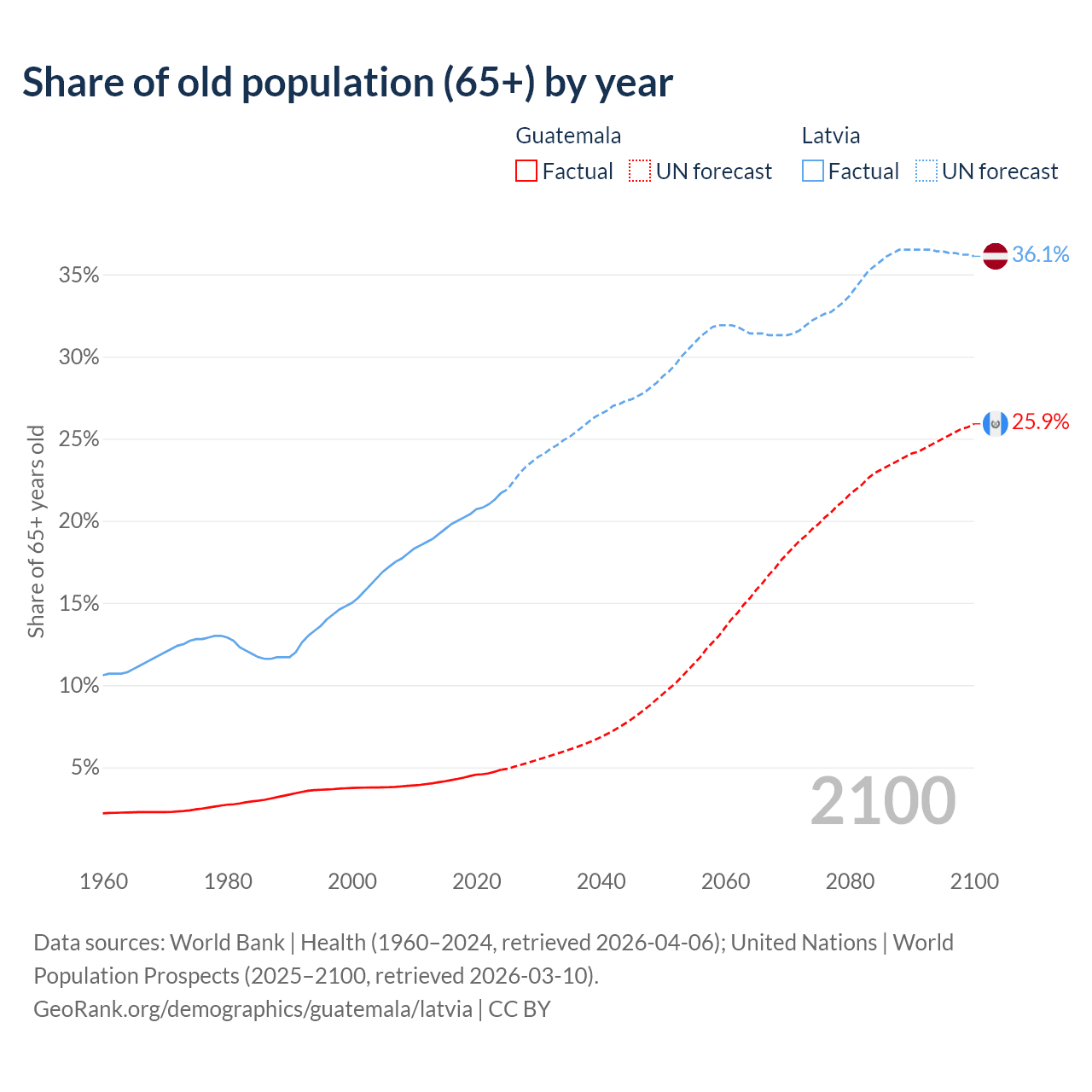 - The share of old-age demographic (65+) in Guatemala is 4.85% vs 21.7% in Latvia.