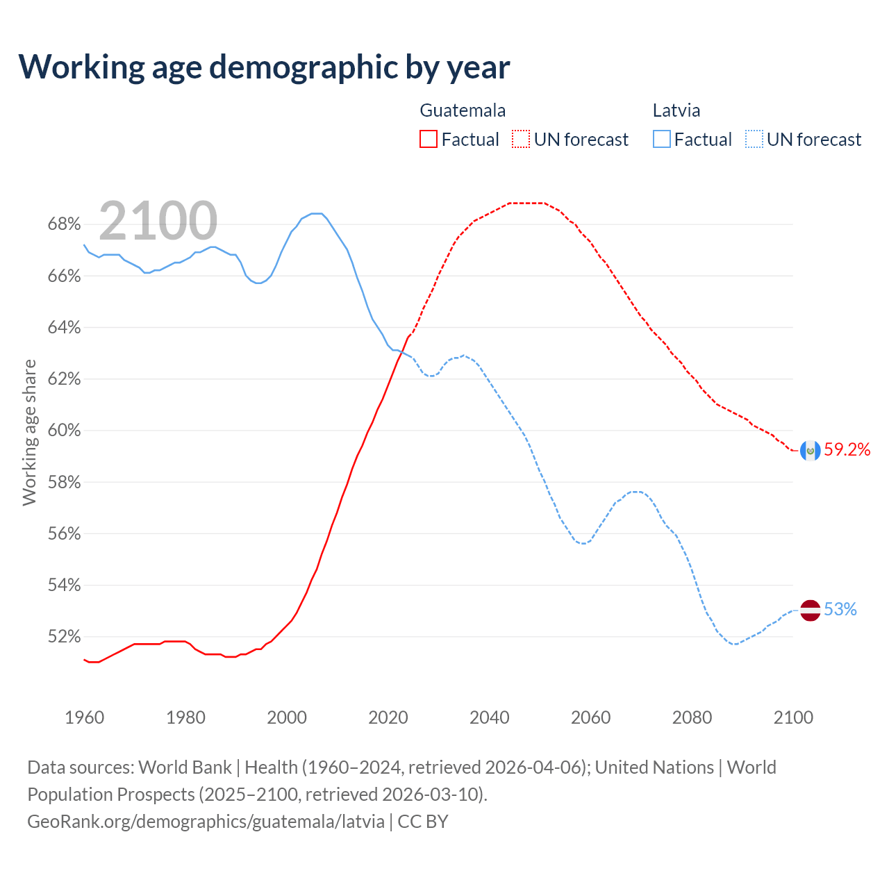Median age Guatemala vs Latvia, 1960-2100