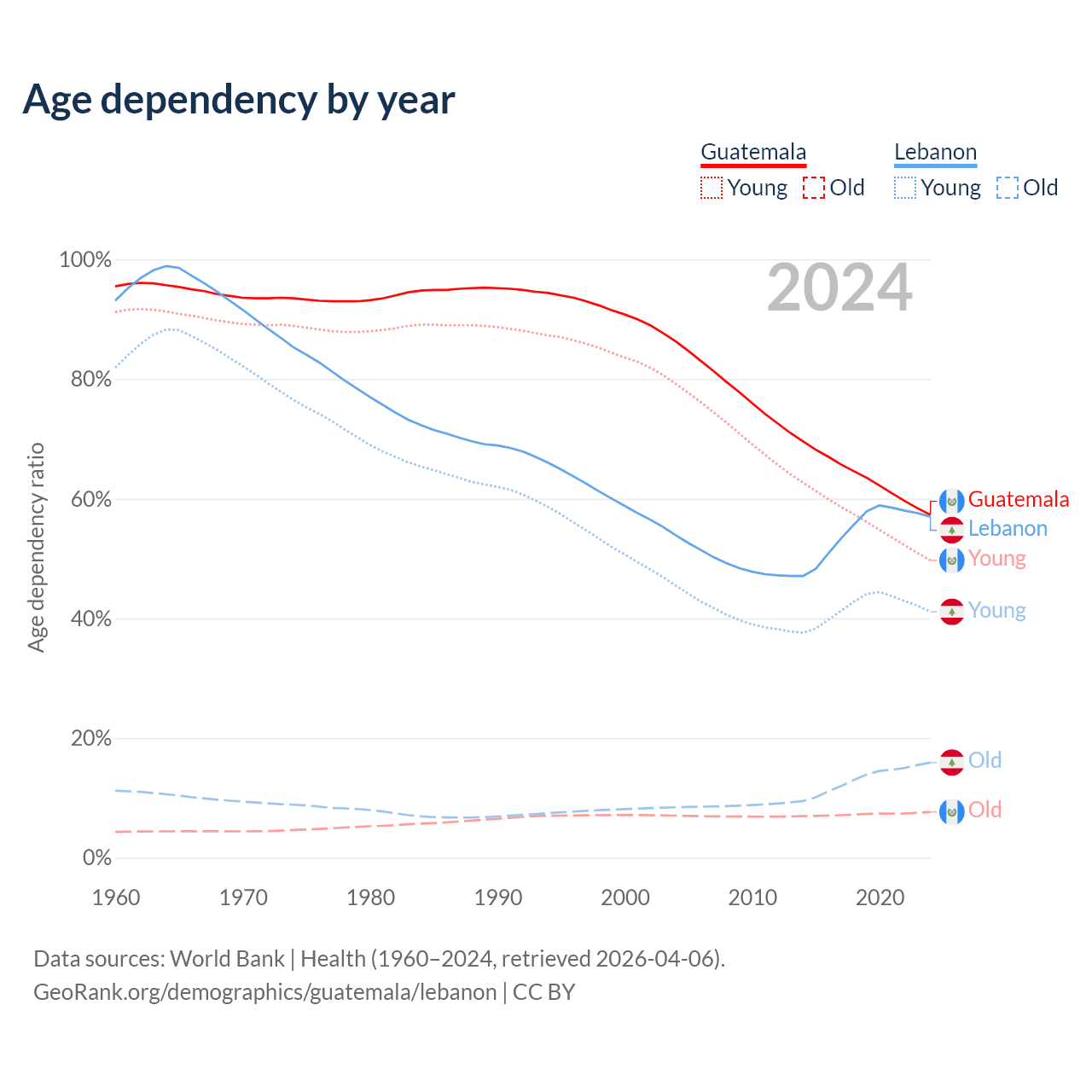 - The median age in Guatemala is 24 years compared to 29.6 years in Lebanon.