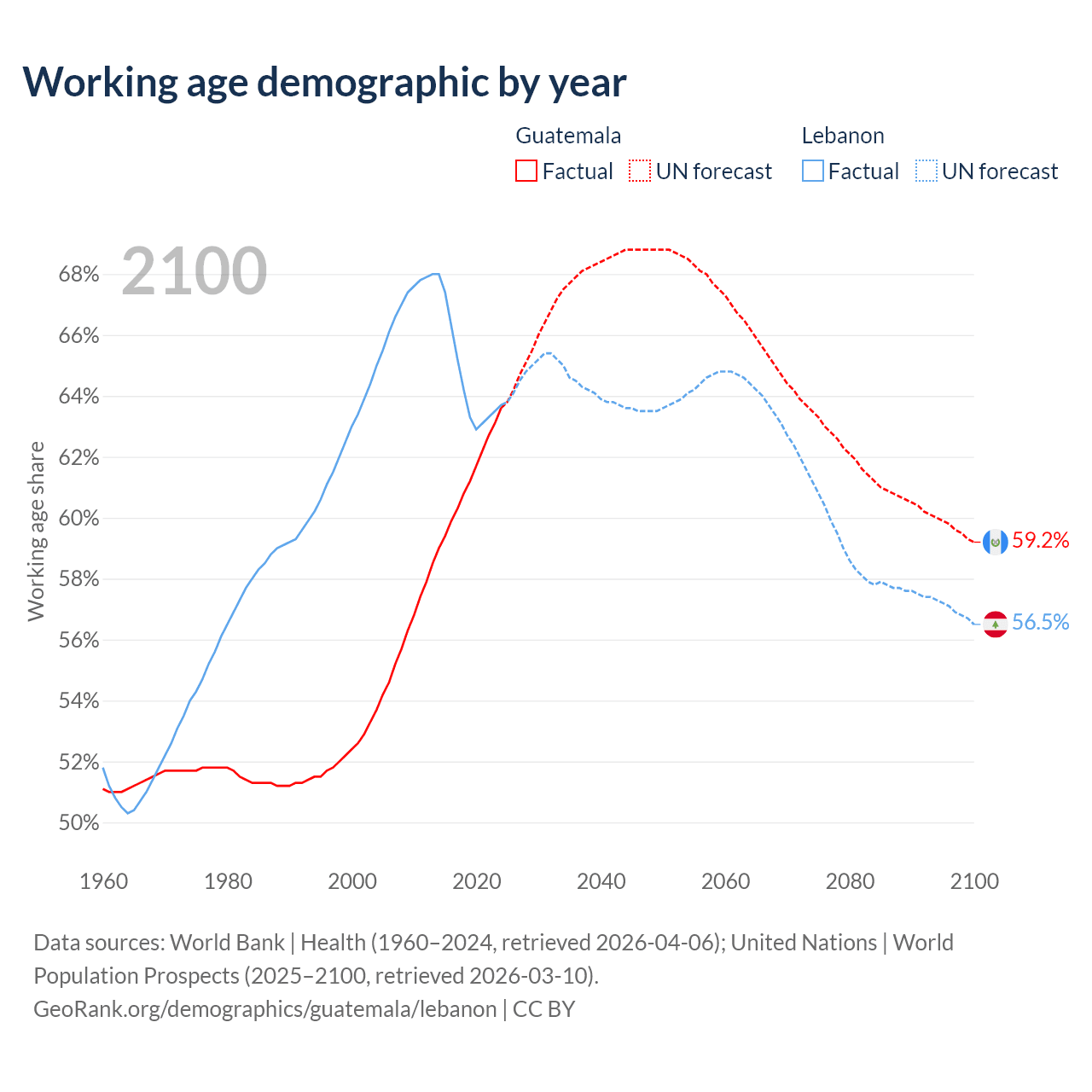 - Guatemala has 12.1M working age adults (aged 15-64) vs 3.76M in Lebanon.