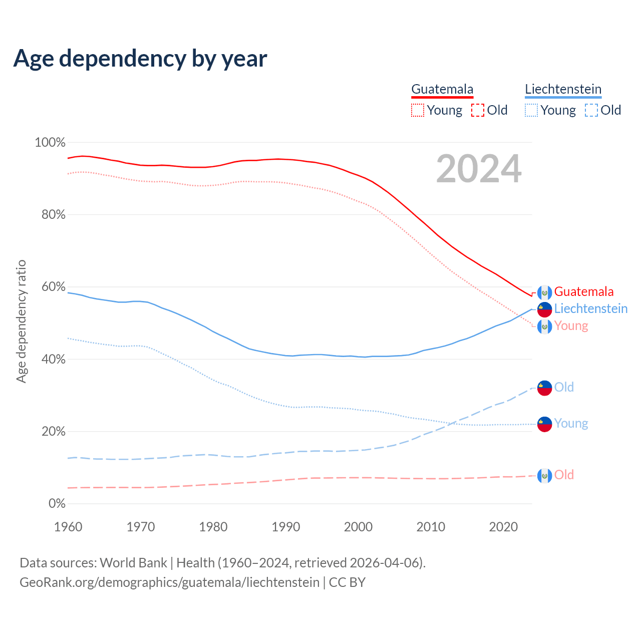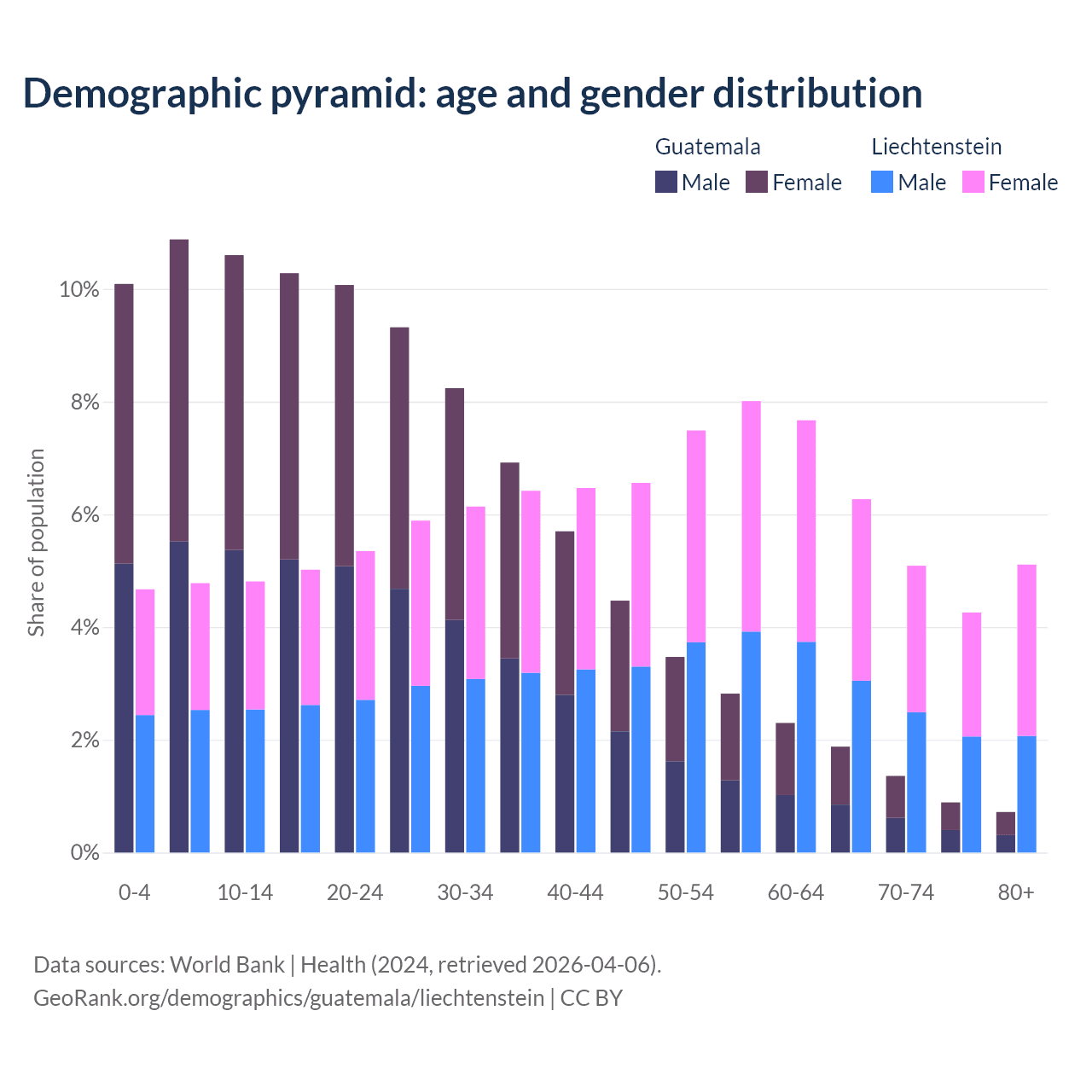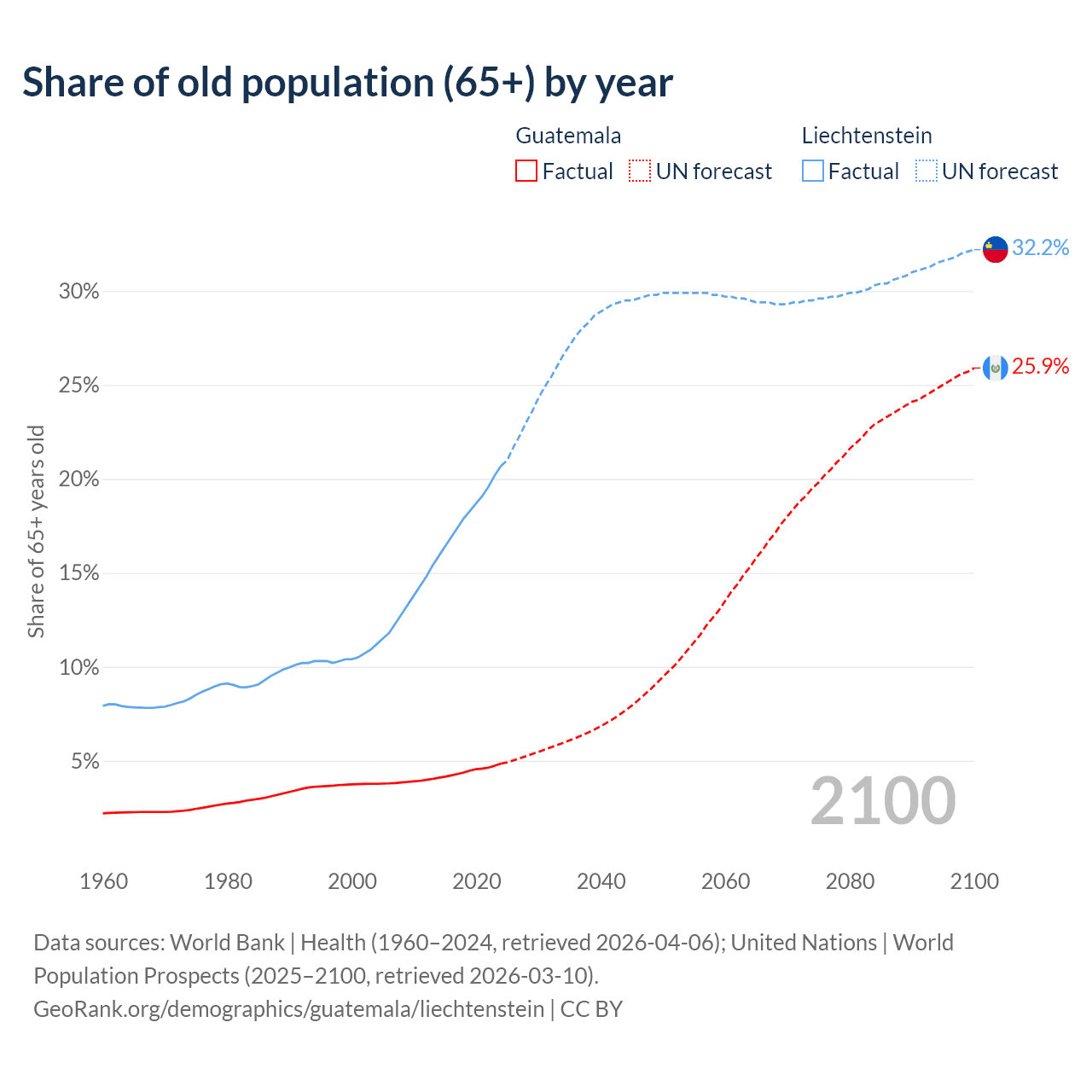 - The share of old-age demographic (65+) in Guatemala is 4.85% vs 20.7% in Liechtenstein.