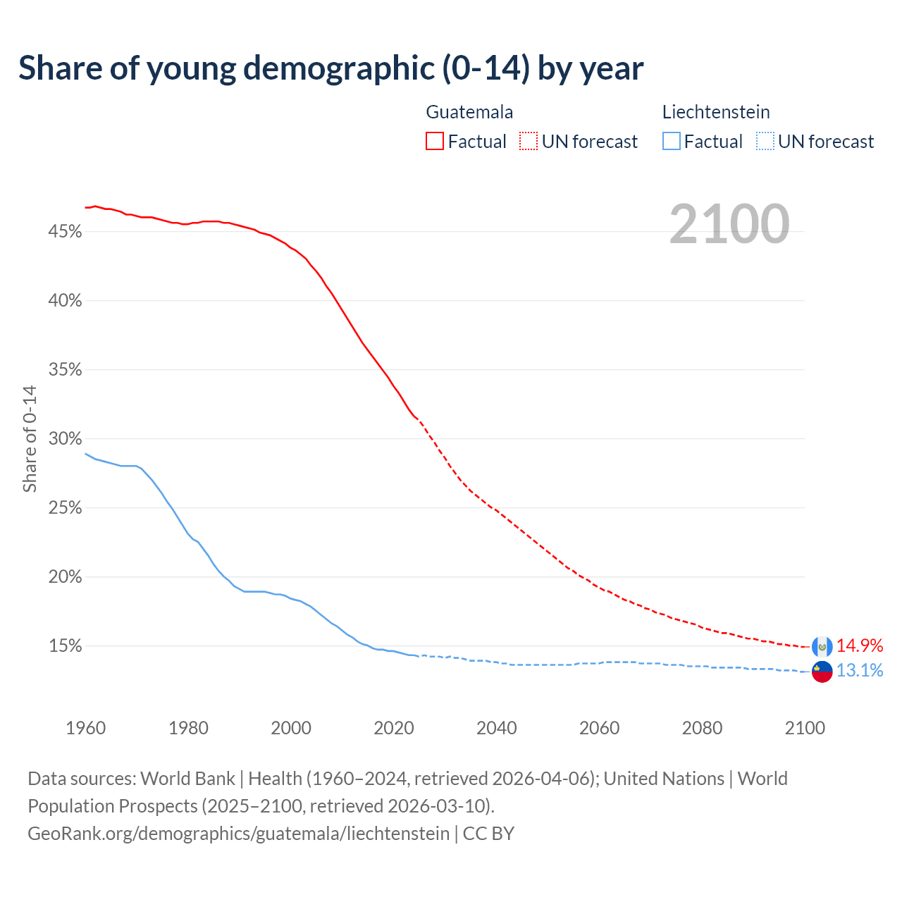- The share of young demographic (0-15 years old) in Guatemala is 31.6% vs 14.3% in Liechtenstein.