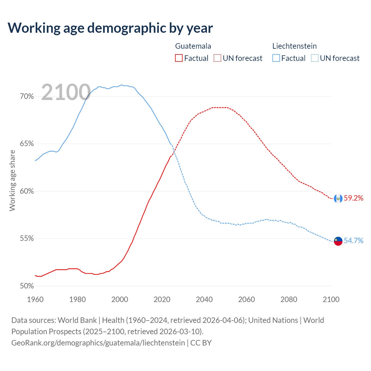 - Guatemala has 12.1M working age adults (aged 15-64) vs 26.7K in Liechtenstein.