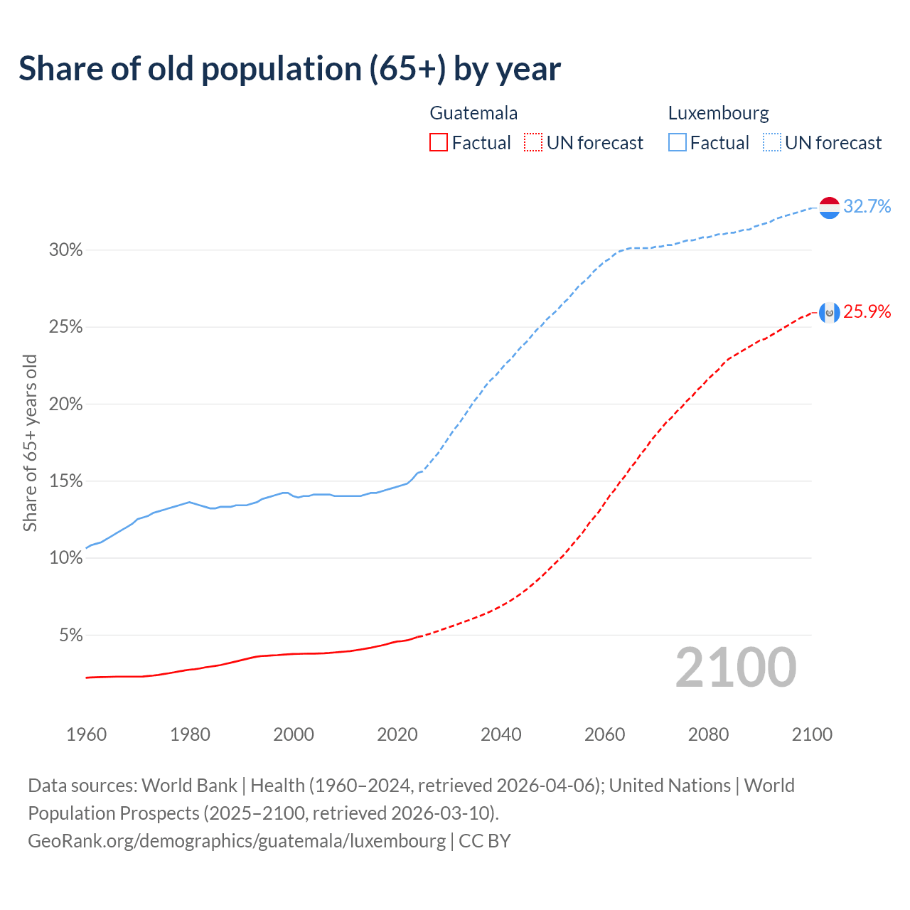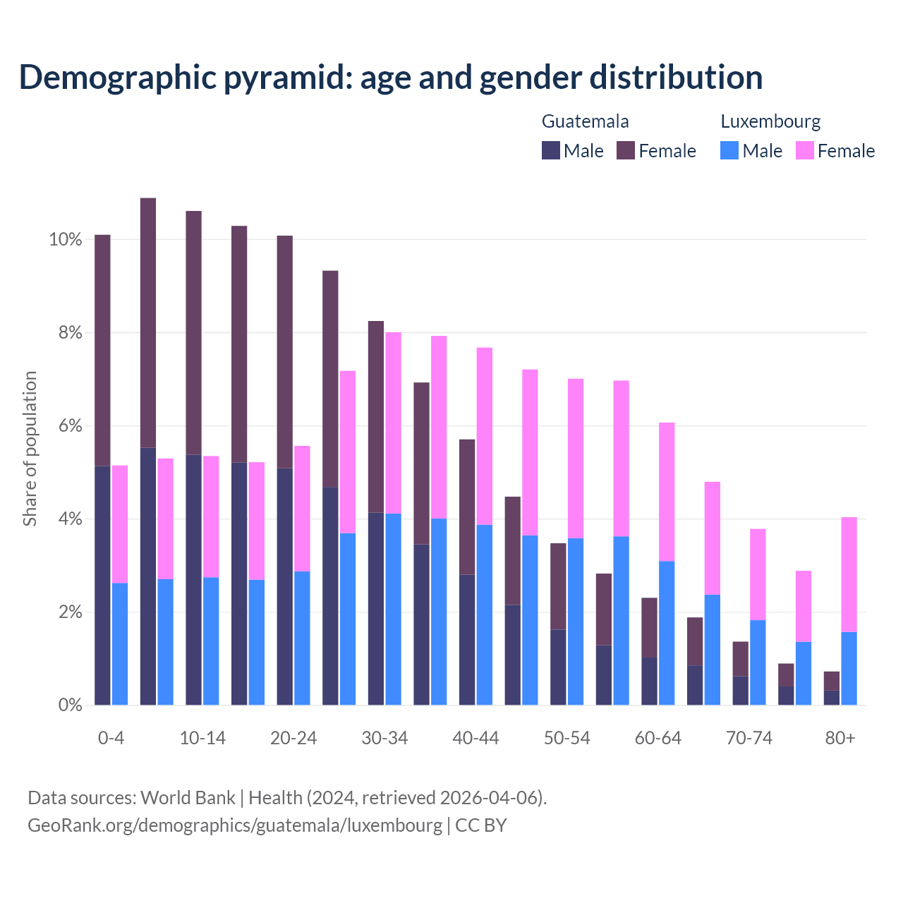 The share of older people aged 65 and over is 4.85% in Guatemala and 15.5% in Luxembourg. Life expectancy in Guatemala compared to Luxembourg .