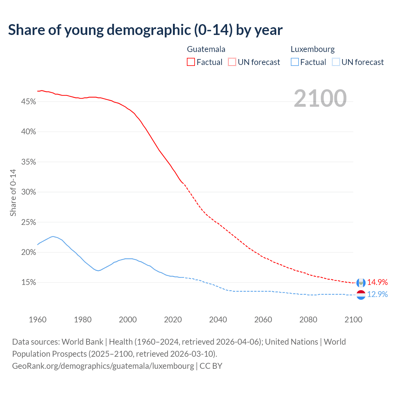 - The share of young demographic (0-15 years old) in Guatemala is 31.6% vs 15.8% in Luxembourg.