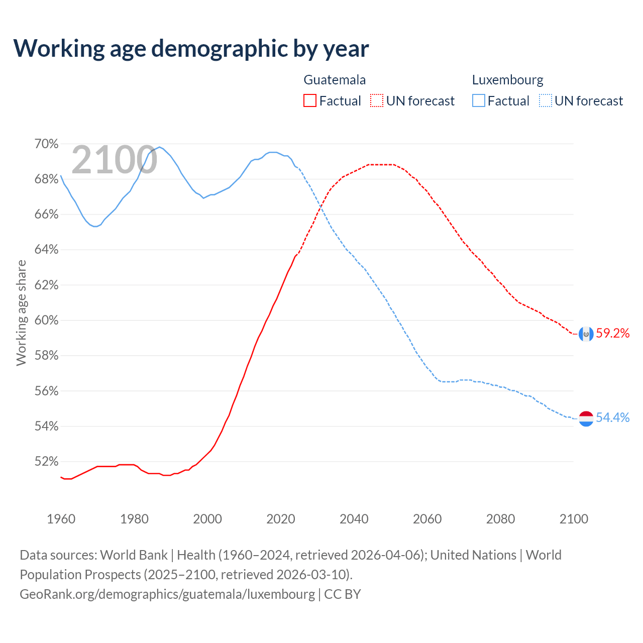 Median age Guatemala vs Luxembourg, 1960-2100