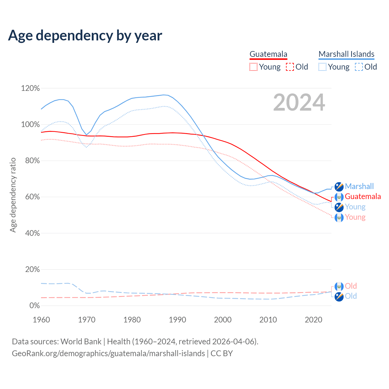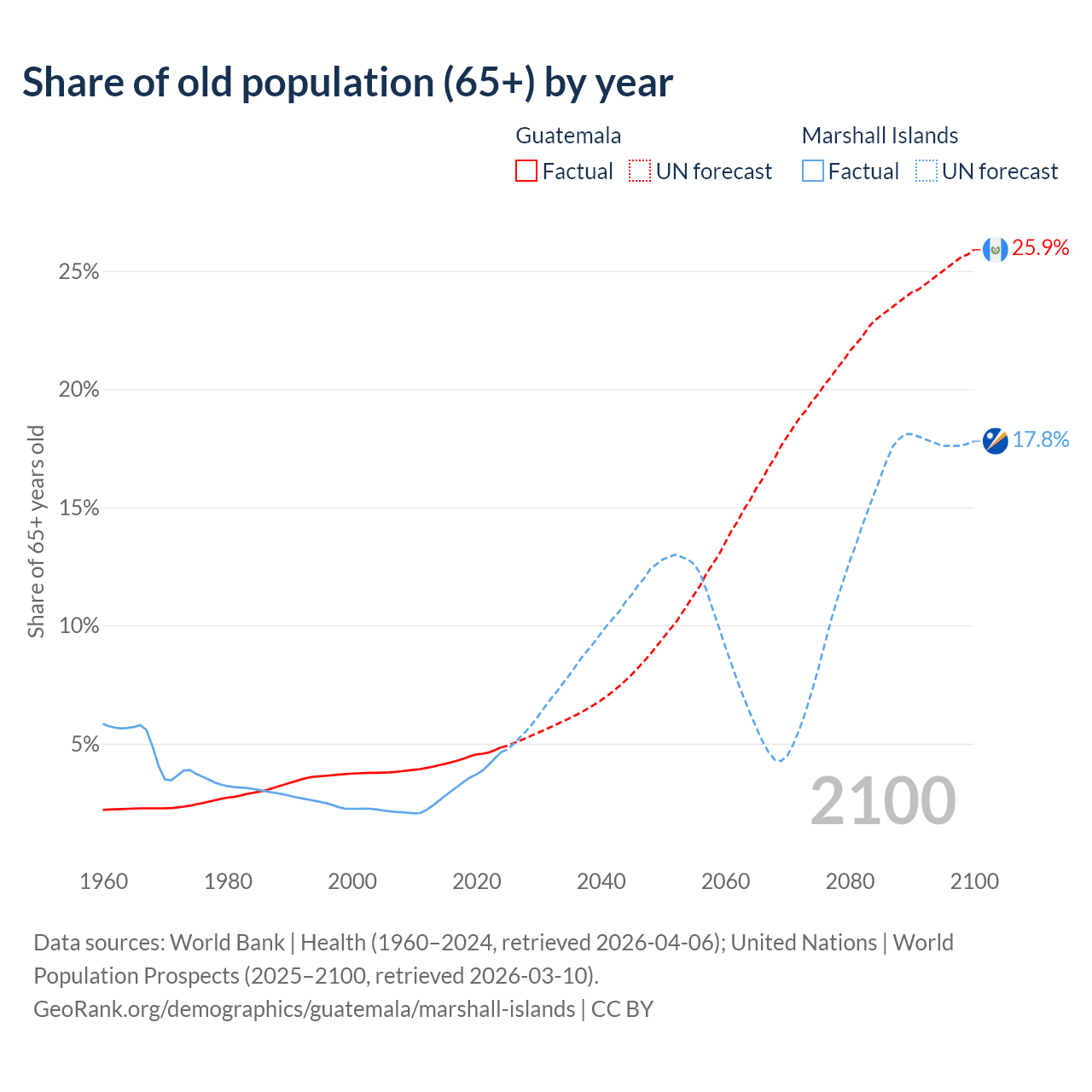 - The share of old-age demographic (65+) in Guatemala is 4.85% vs 4.64% in the Marshall Islands.