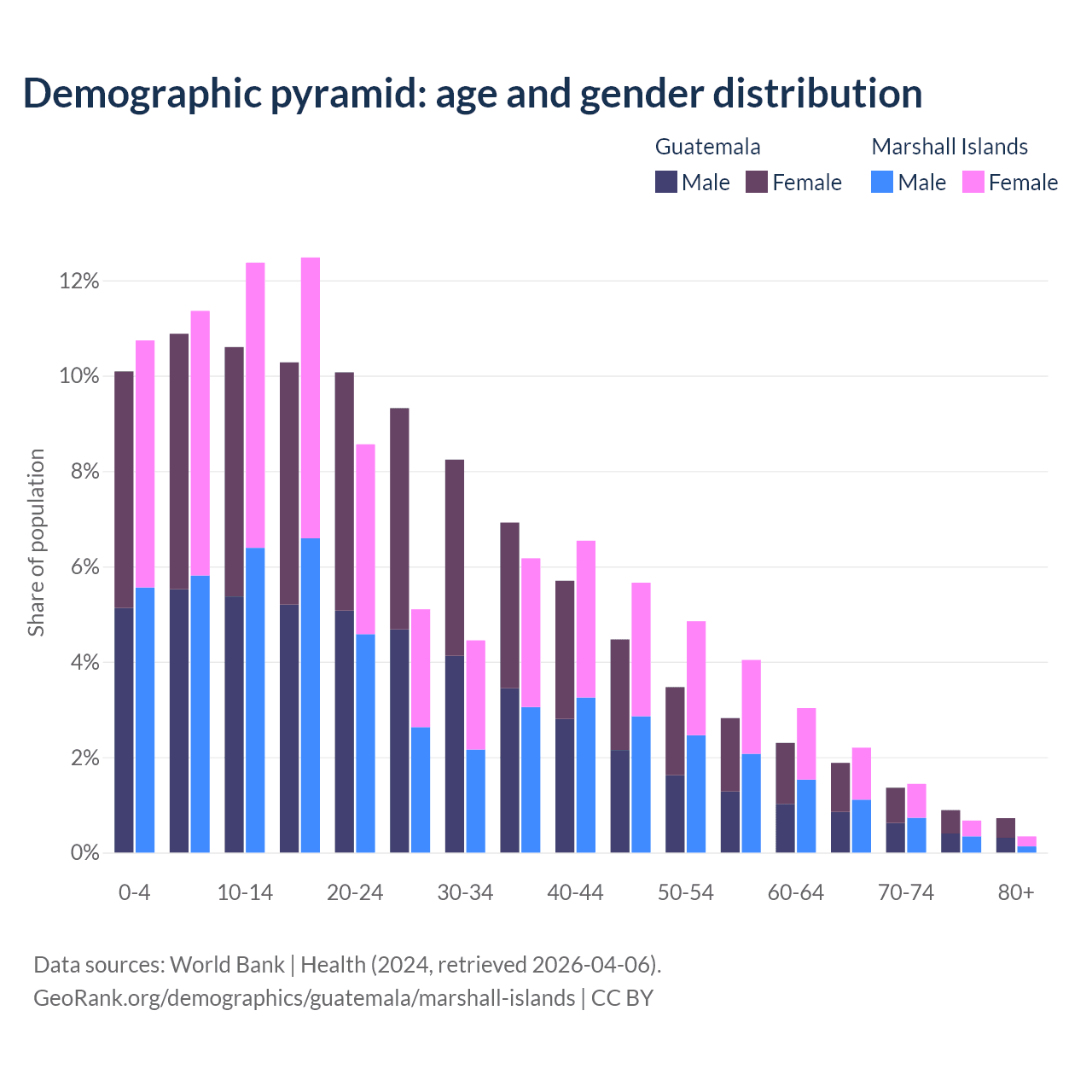 - As of 2026, the population of Guatemala is 19M vs 35.1K in the Marshall Islands - 543 times difference.