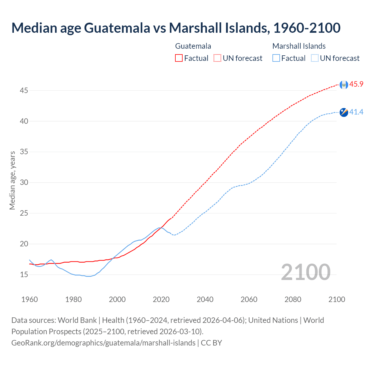 Median age Guatemala vs Marshall Islands, 1960-2100