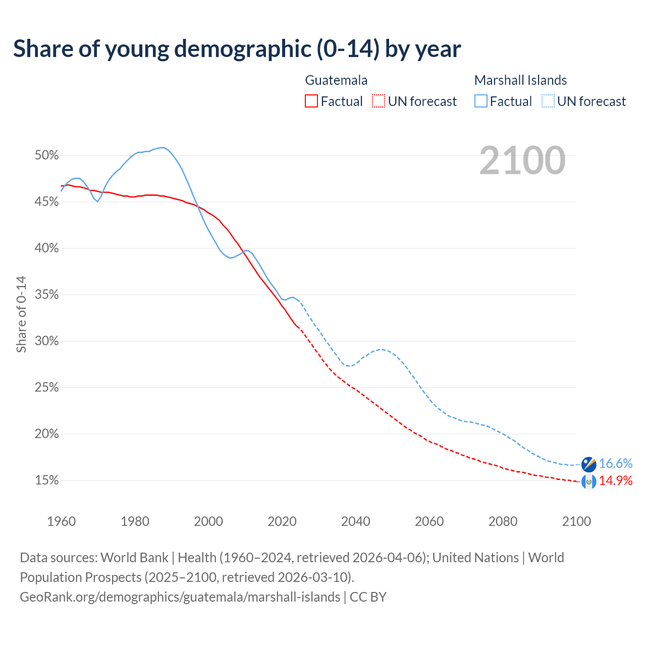 - The share of young demographic (0-15 years old) in Guatemala is 31.6% vs 34.5% in the Marshall Islands.