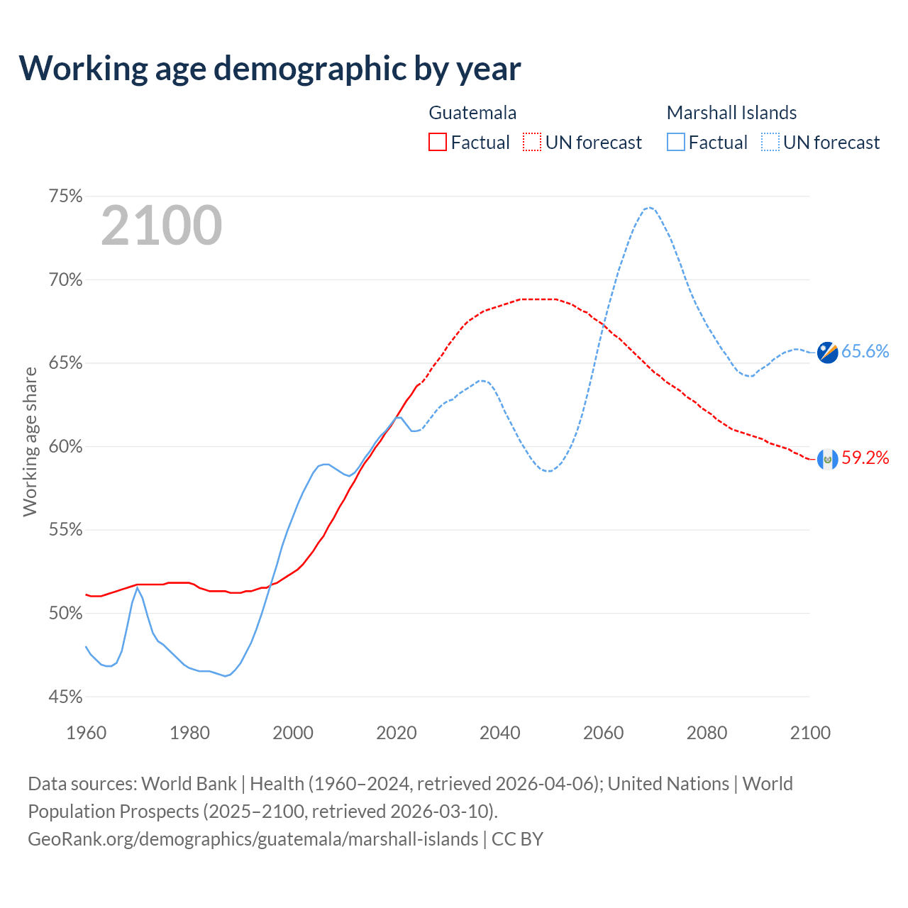 - Guatemala has 12.1M working age adults (aged 15-64) vs 21.3K in the Marshall Islands.