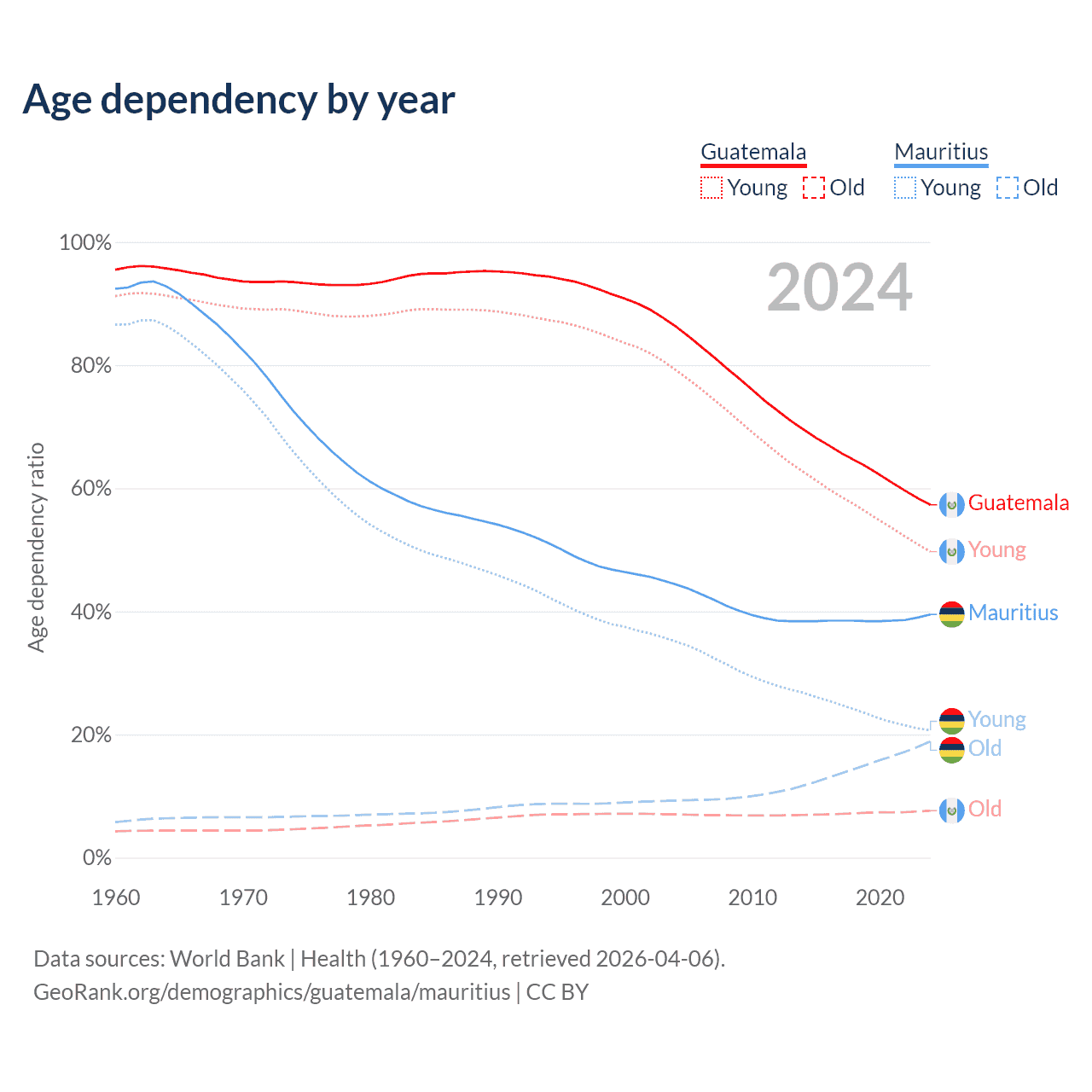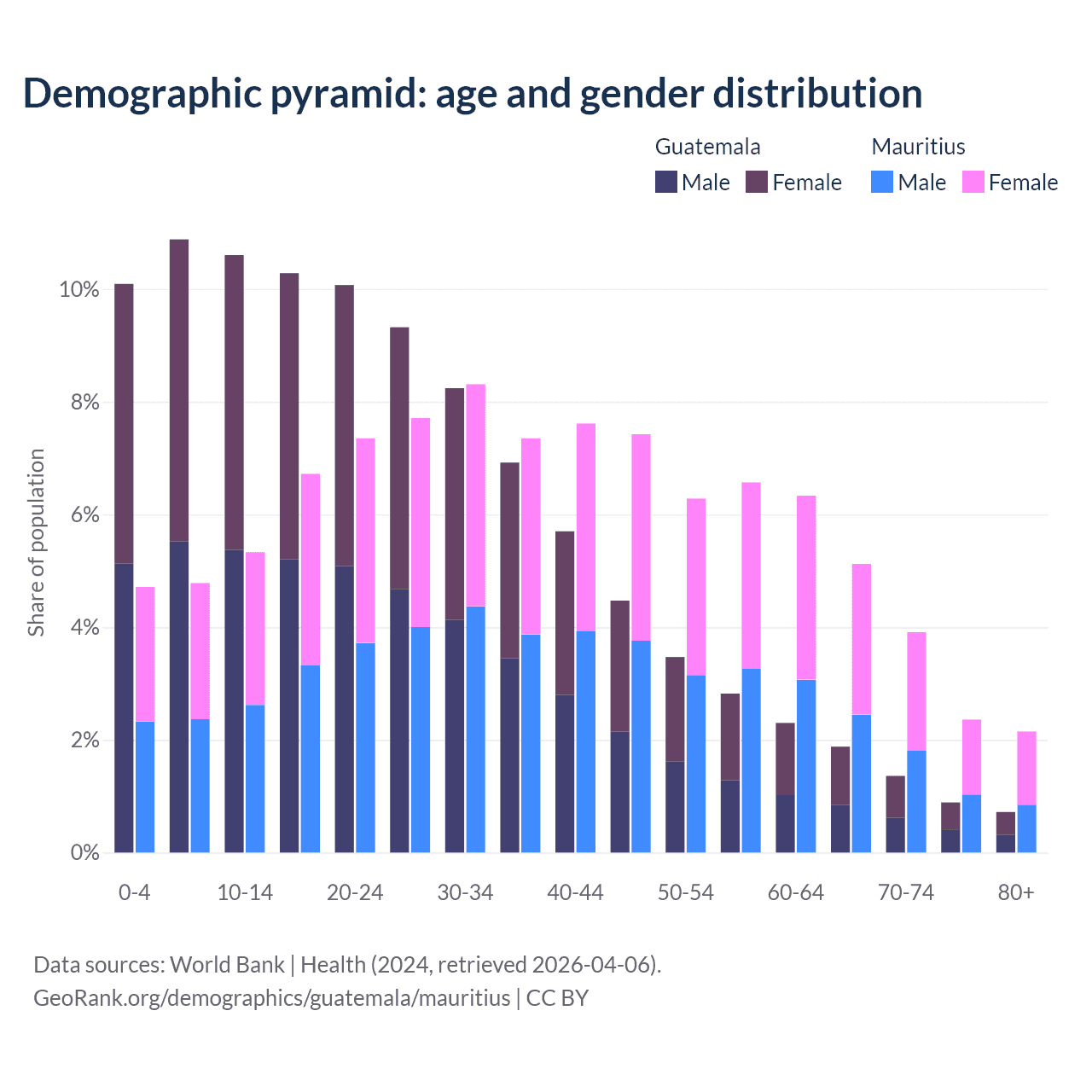- The median age in Guatemala is 24 years compared to 38.5 years in Mauritius.