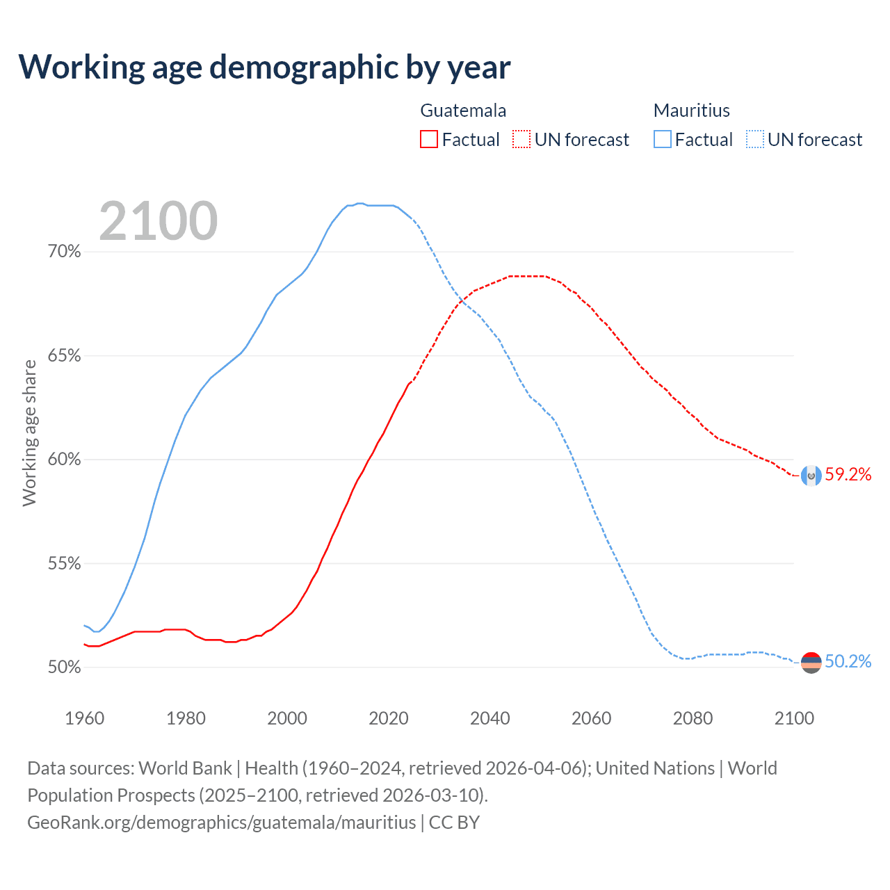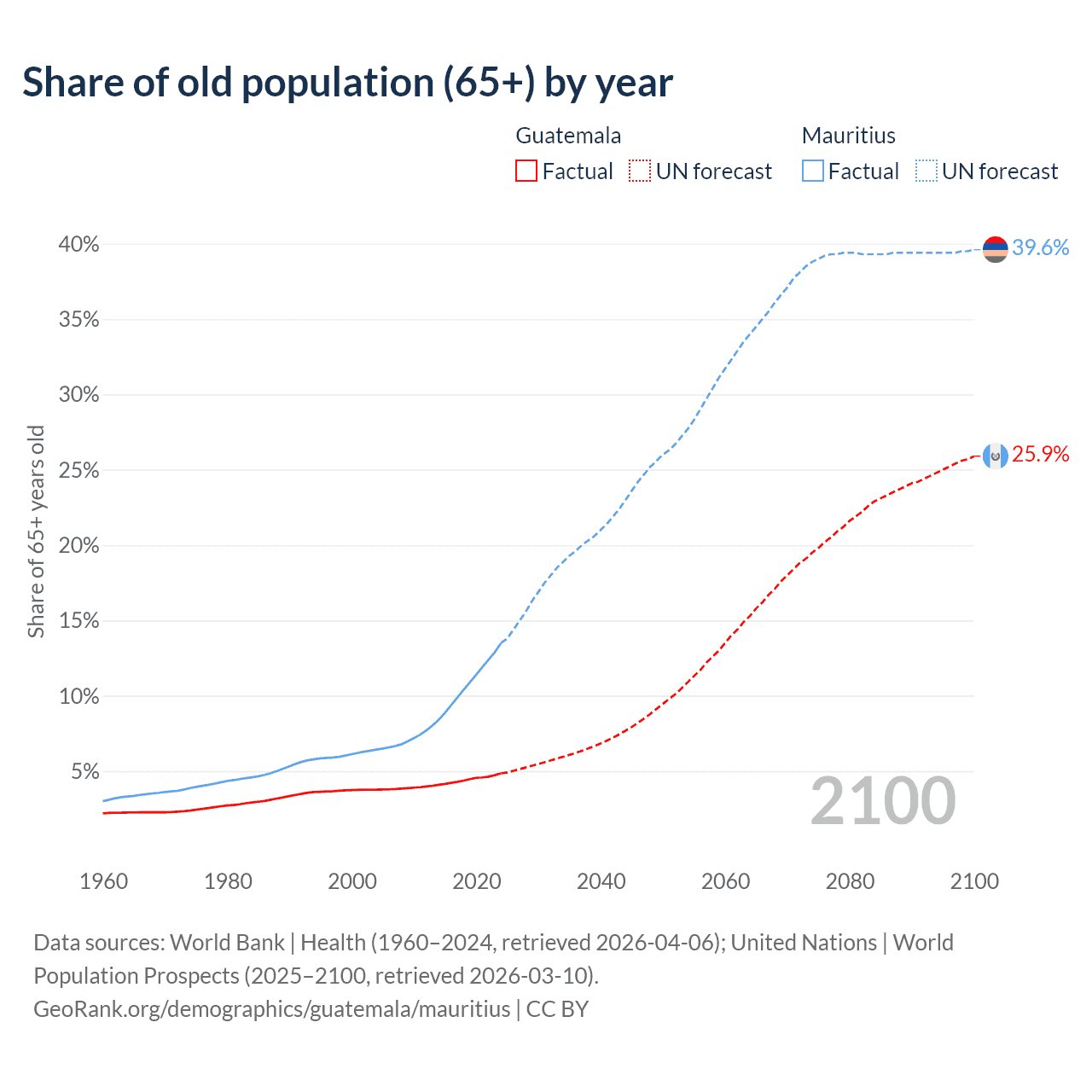 Median age Guatemala vs Mauritius, 1960-2100