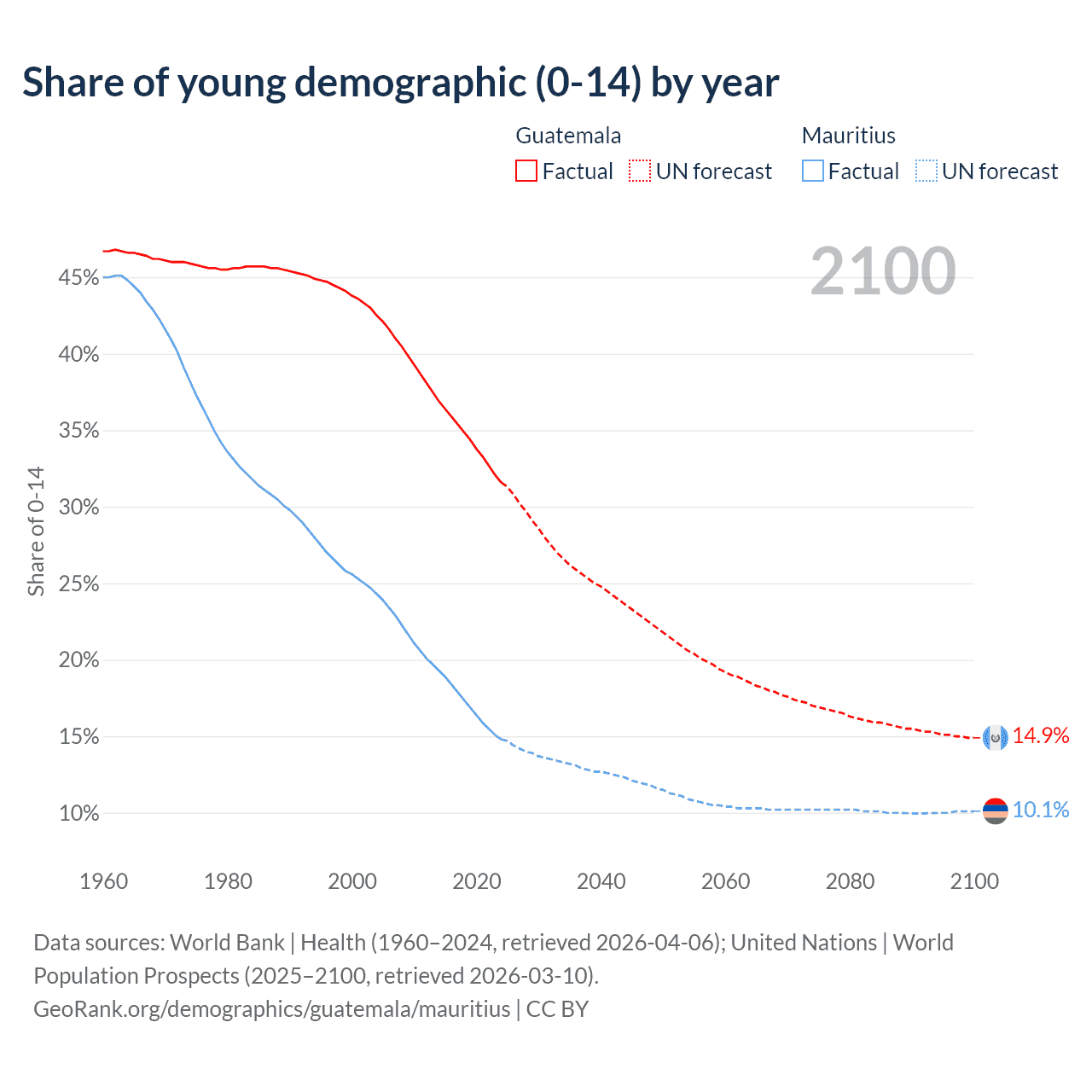 - The share of young demographic (0-15 years old) in Guatemala is 31.6% vs 14.8% in Mauritius.