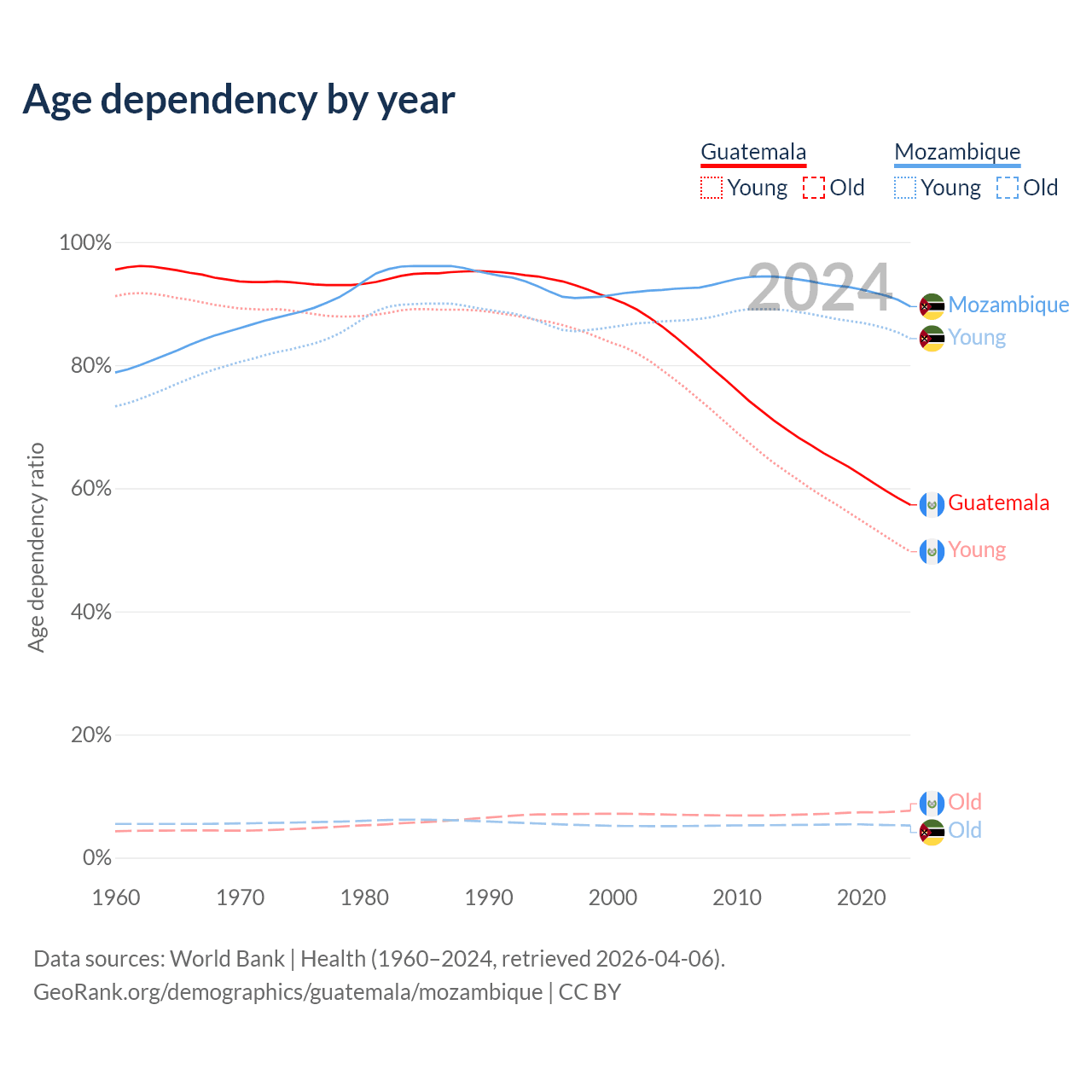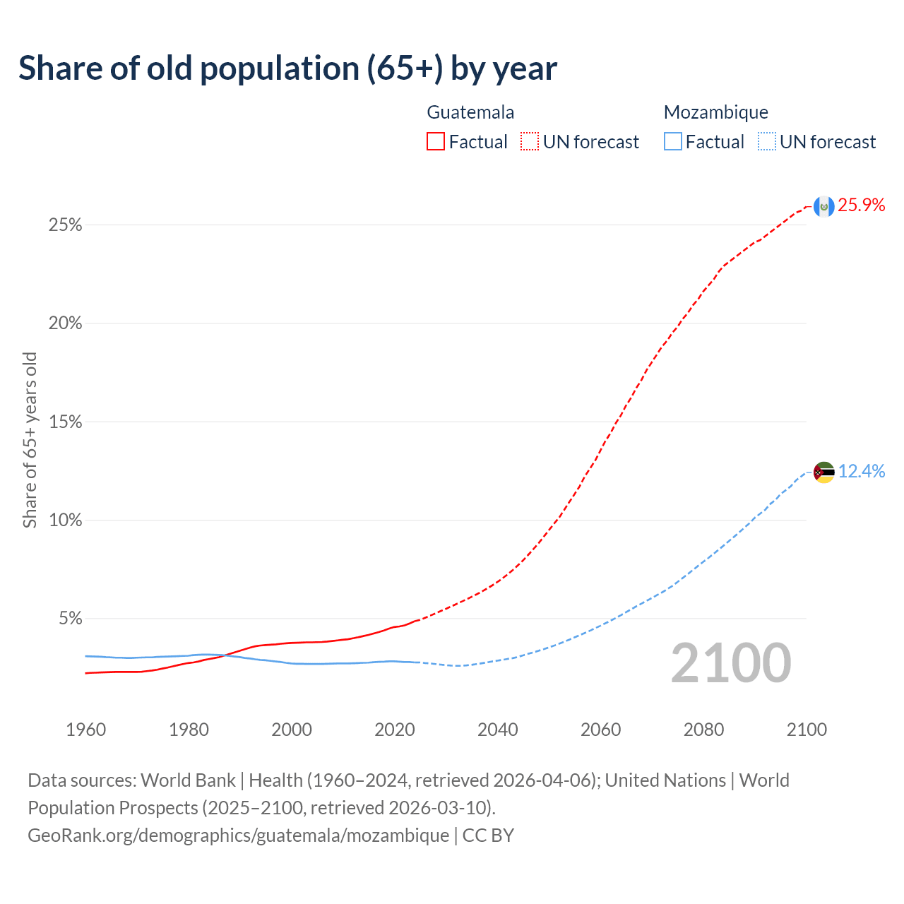 - The share of old-age demographic (65+) in Guatemala is 4.85% vs 2.75% in Mozambique.