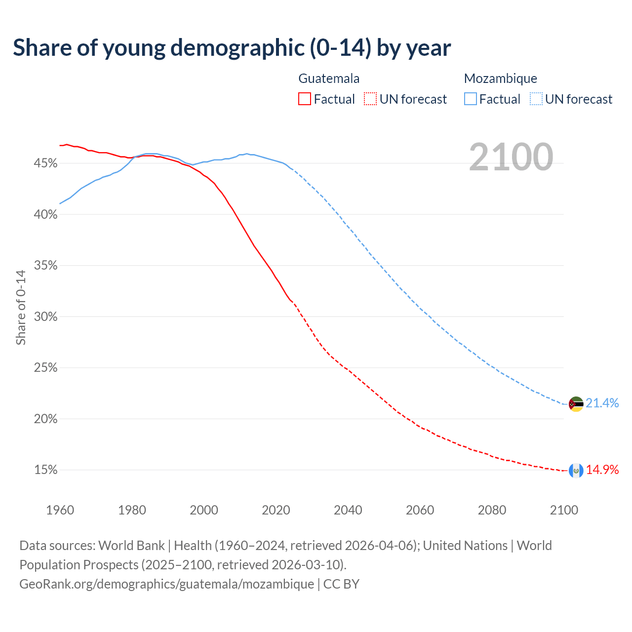 - The share of young demographic (0-15 years old) in Guatemala is 31.6% vs 44.5% in Mozambique.