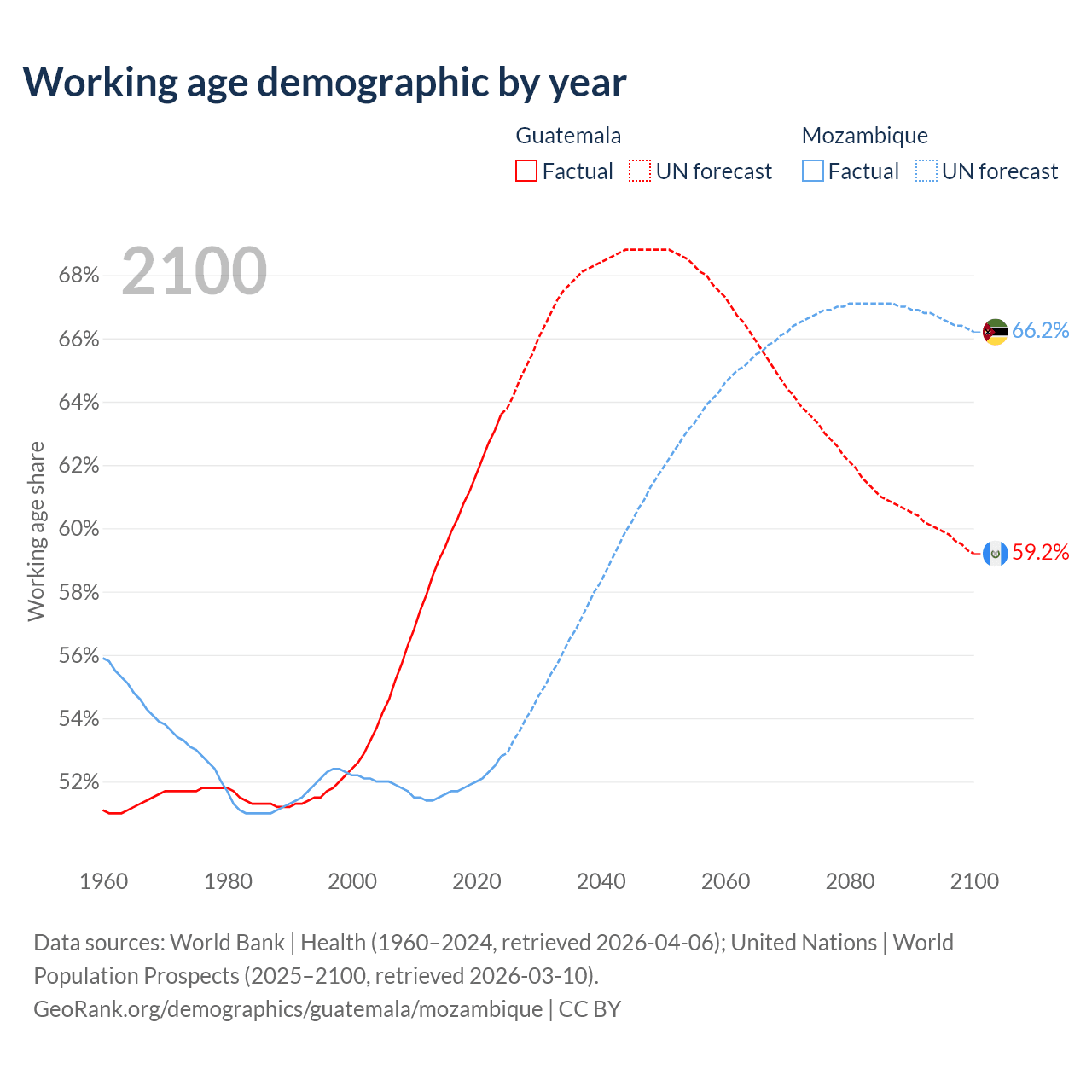 - Guatemala has 12.1M working age adults (aged 15-64) vs 19.5M in Mozambique.